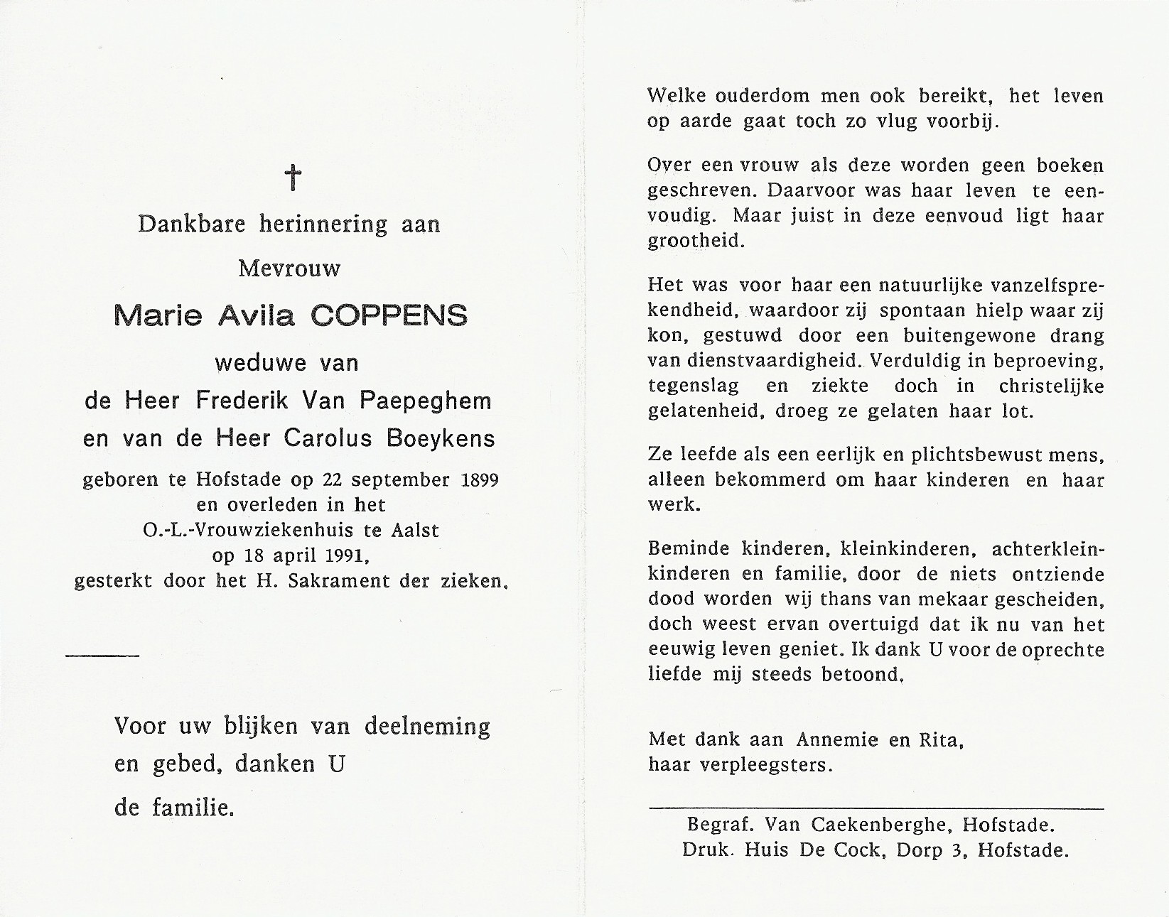 Overlijden van een echtgenote | Marie Avila Coppens 18 april 1991 (Leeftijd 94 jaar) |