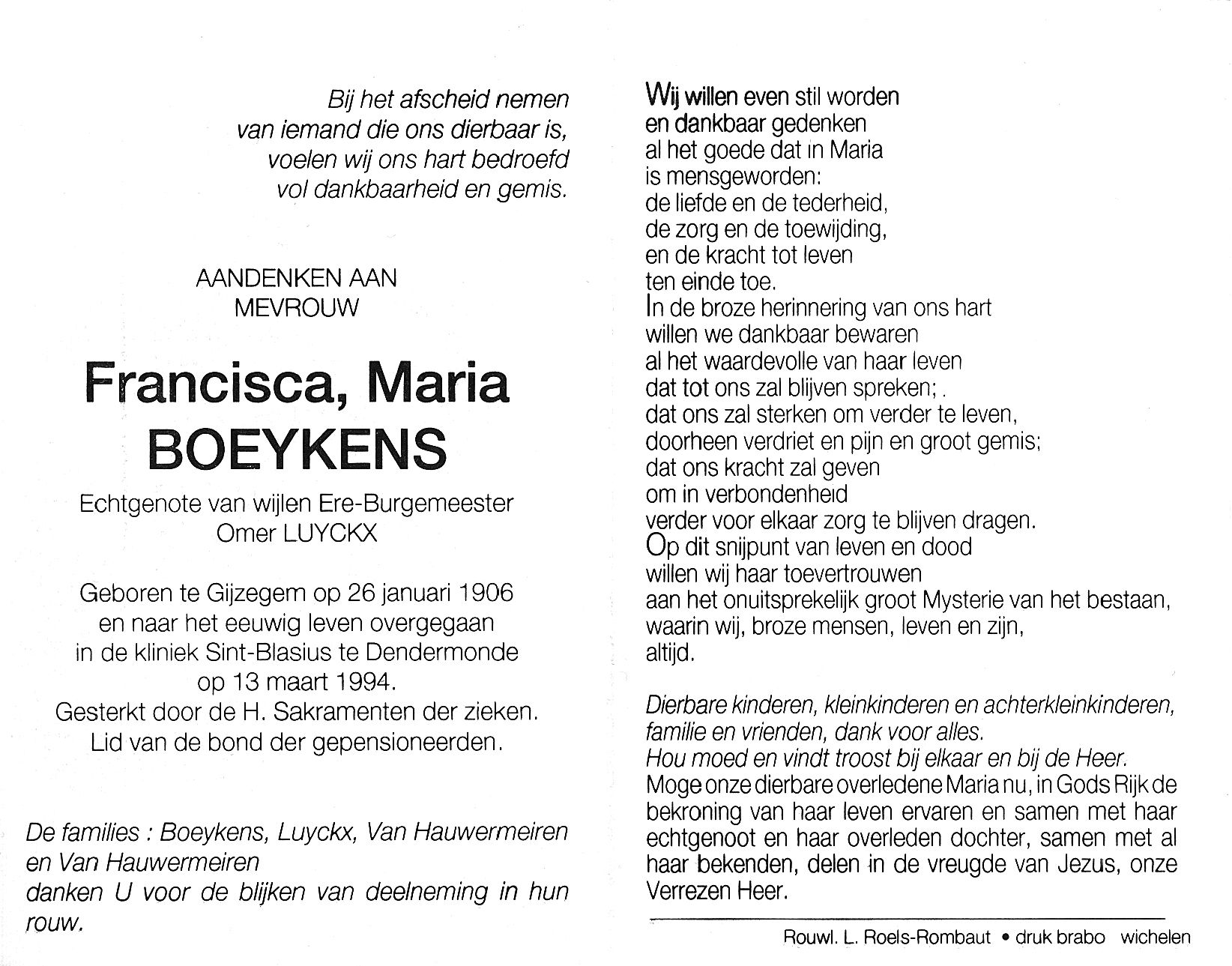 Francisca Maria Boeykens Geboren: 26 januari 1906 45 36 — Gijzegem Overleden: 13 maart 1994 — Dendermonde |