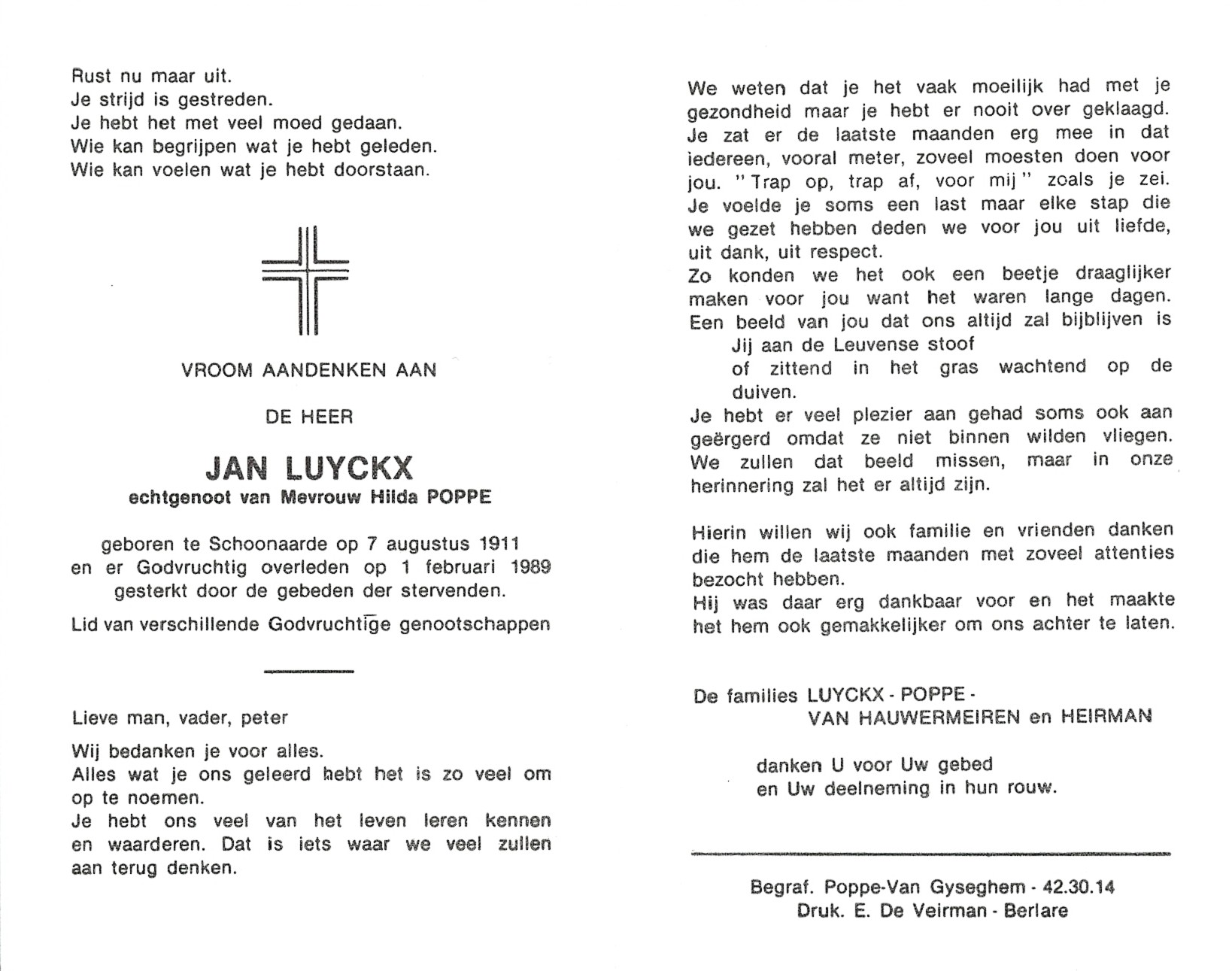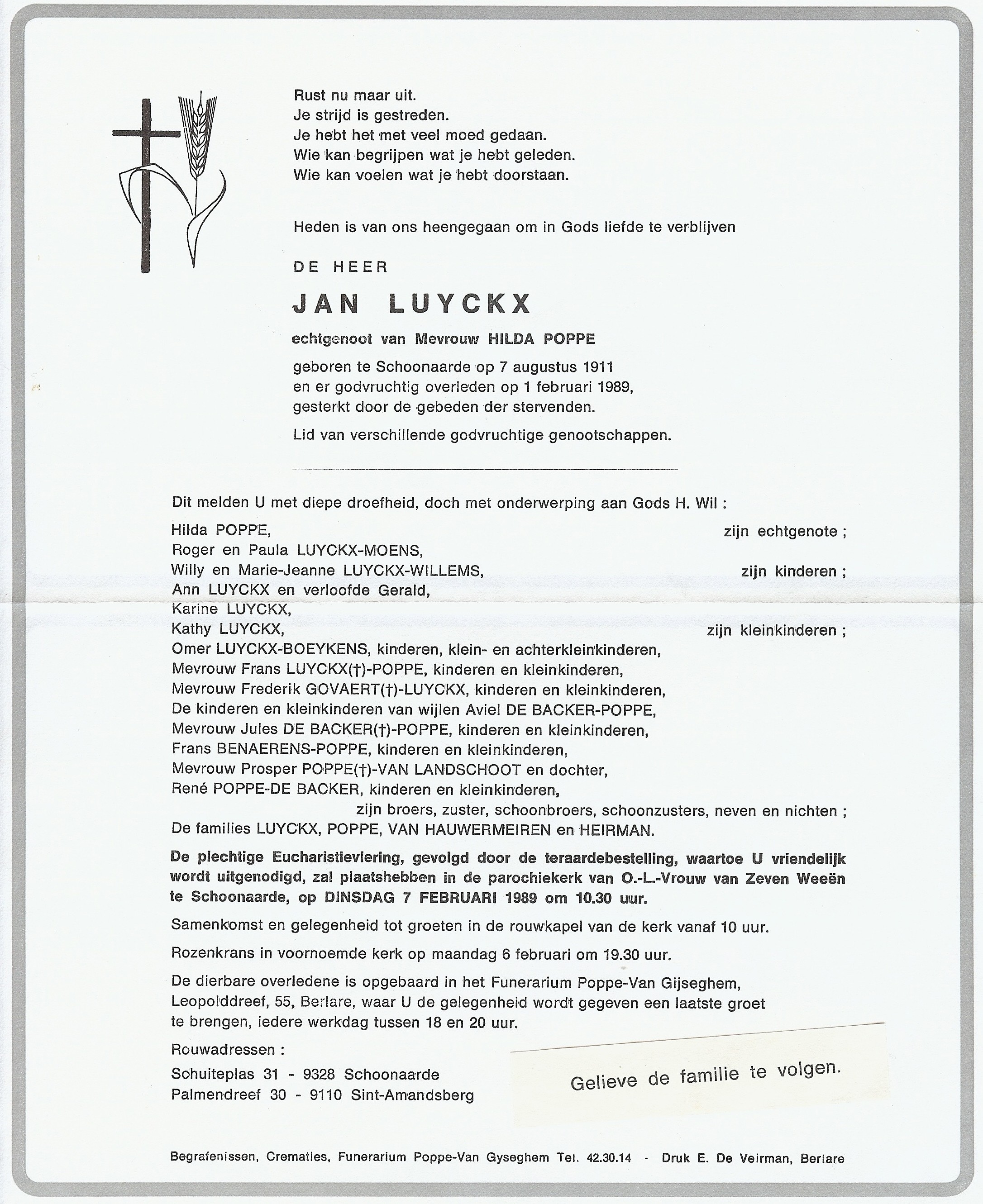 Overlijden van een broer | Jan Luyckx 1 februari 1989 (Leeftijd 84 jaar) |
