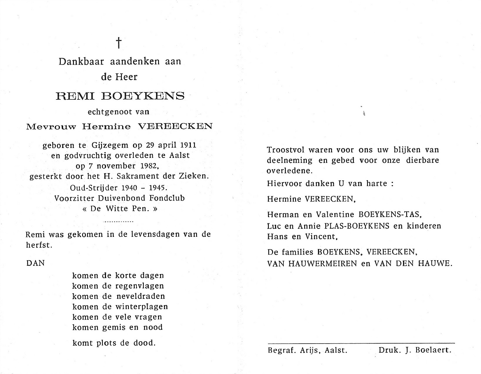 Remi Charles Louis Boeykens Geboren: 29 april 1911 50 41 — Gijzegem Overleden: 7 november 1982 — Aalst |