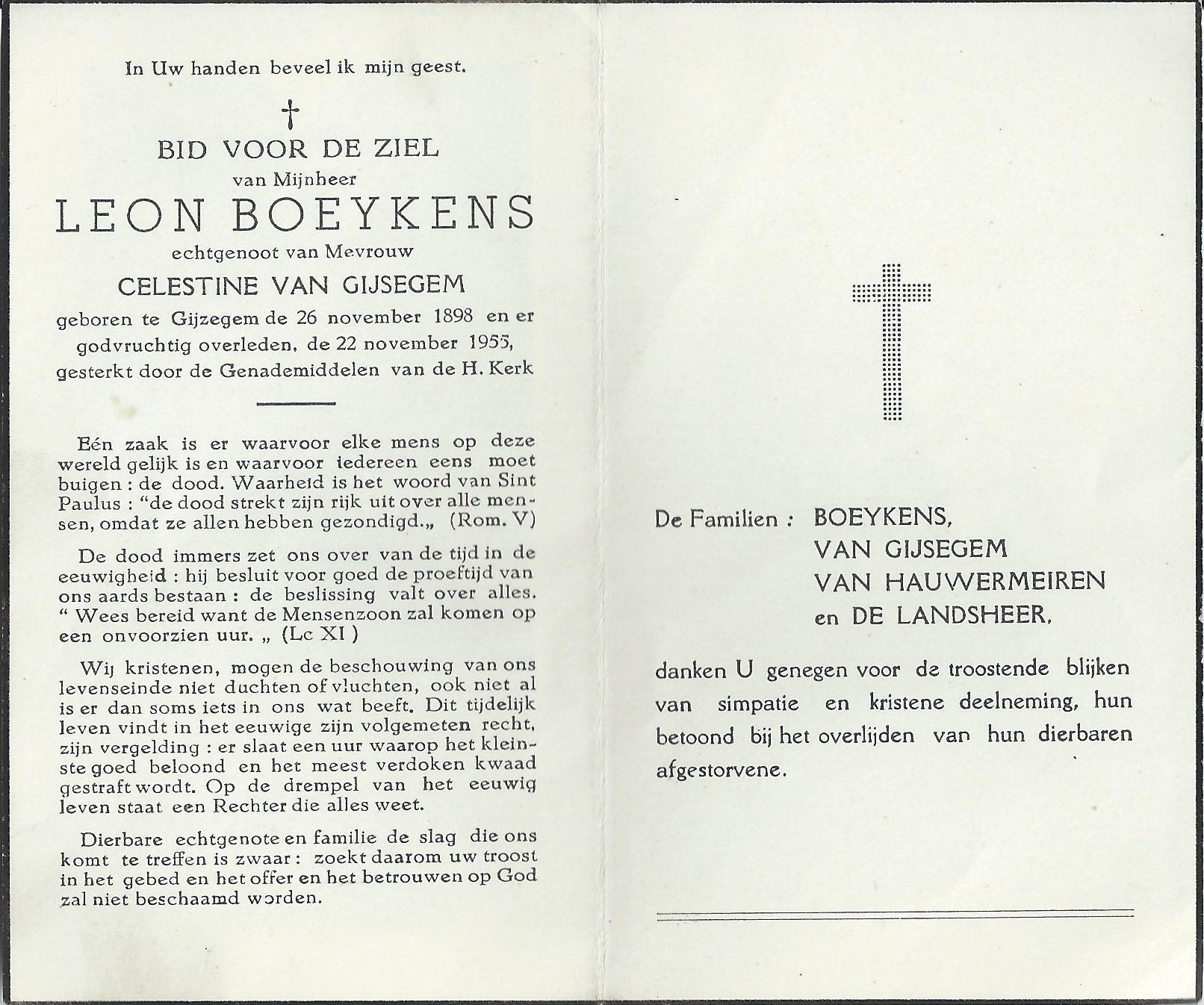 Leon Boeykens Geboren: 26 november 1898 37 29 — Gijzegem Overleden: 22 november 1955 — Gijzegem |