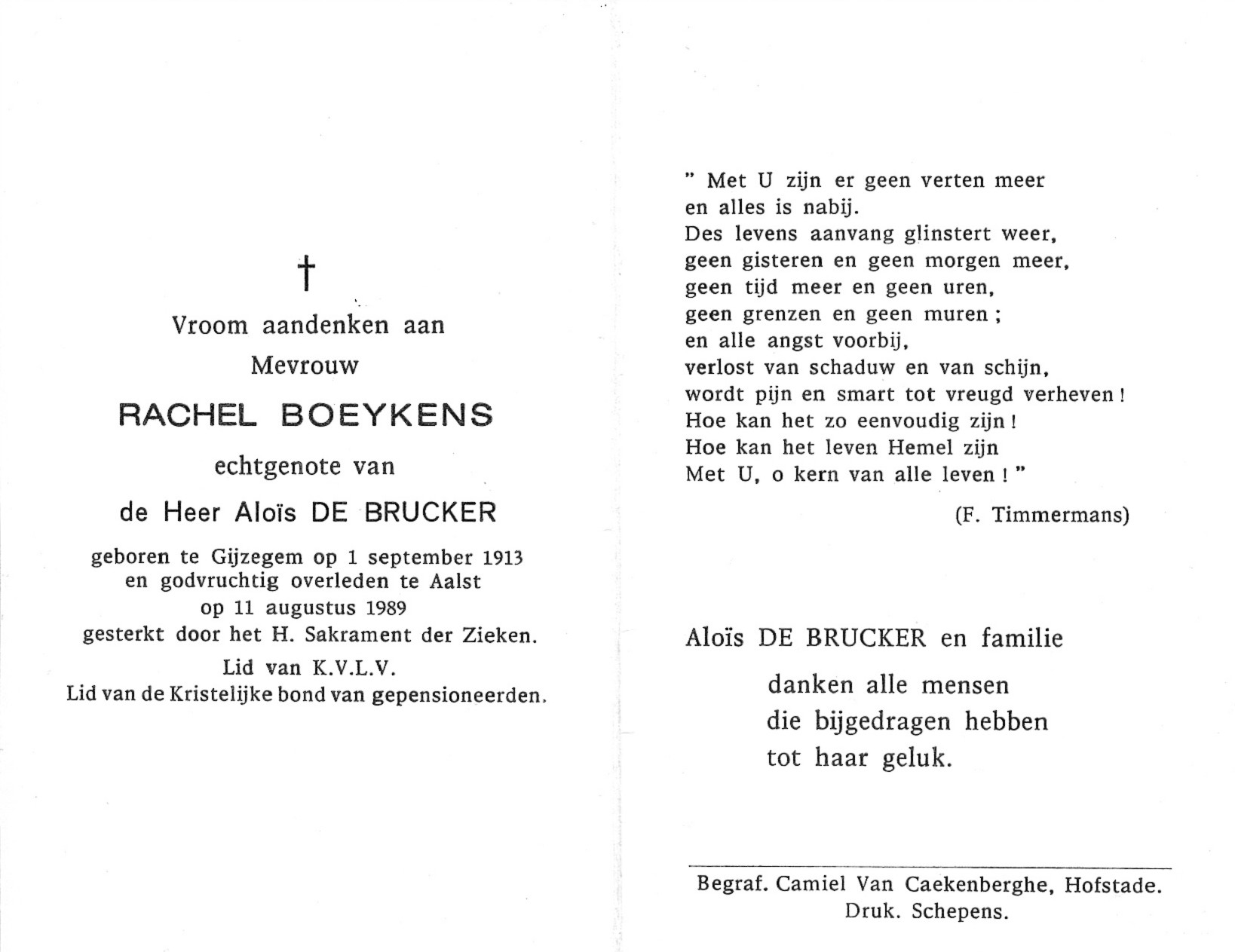 Rachel Boeykens Geboren: 1 september 1913 52 44 — Gijzegem Overleden: 11 augustus 1989 — Aalst |