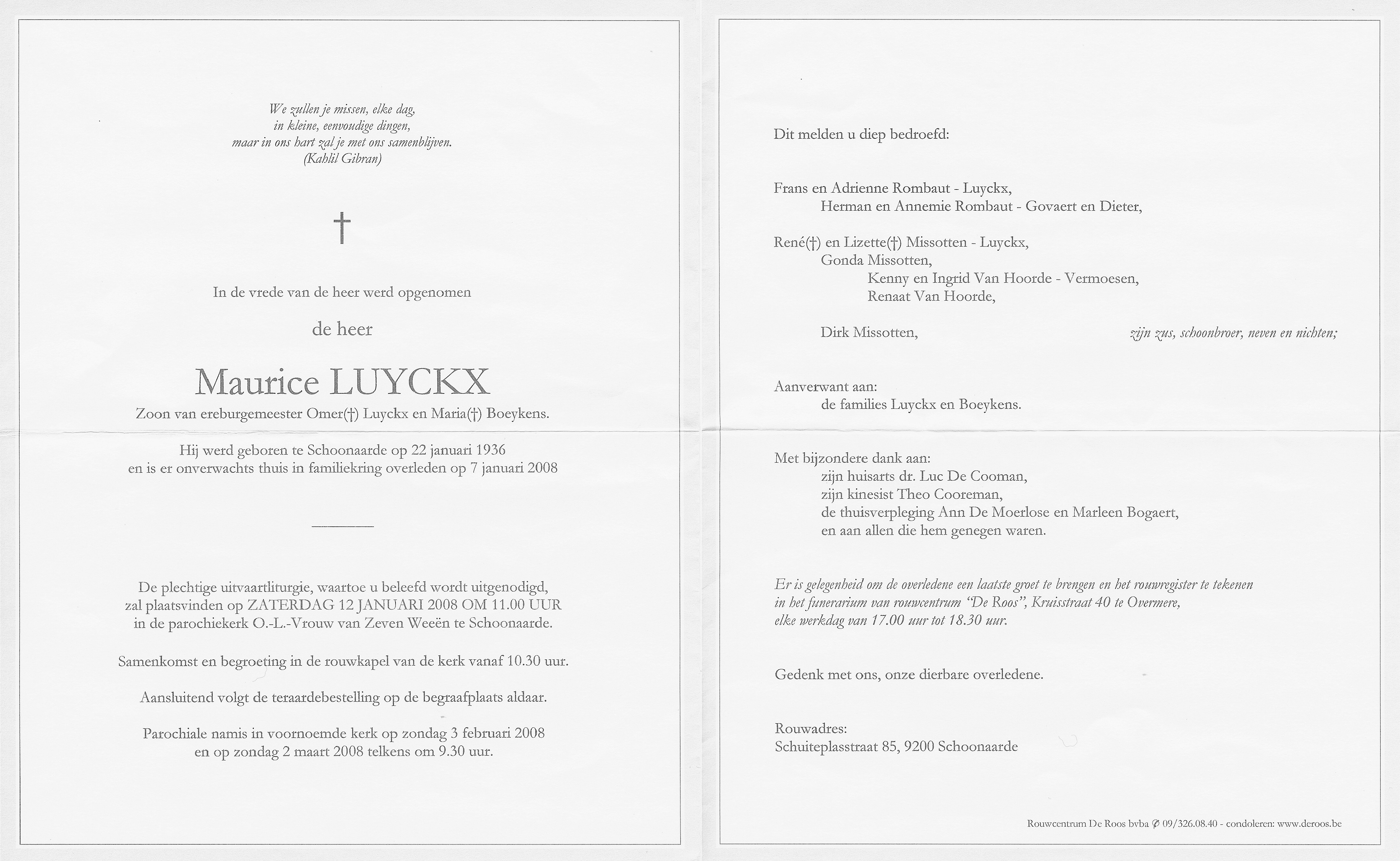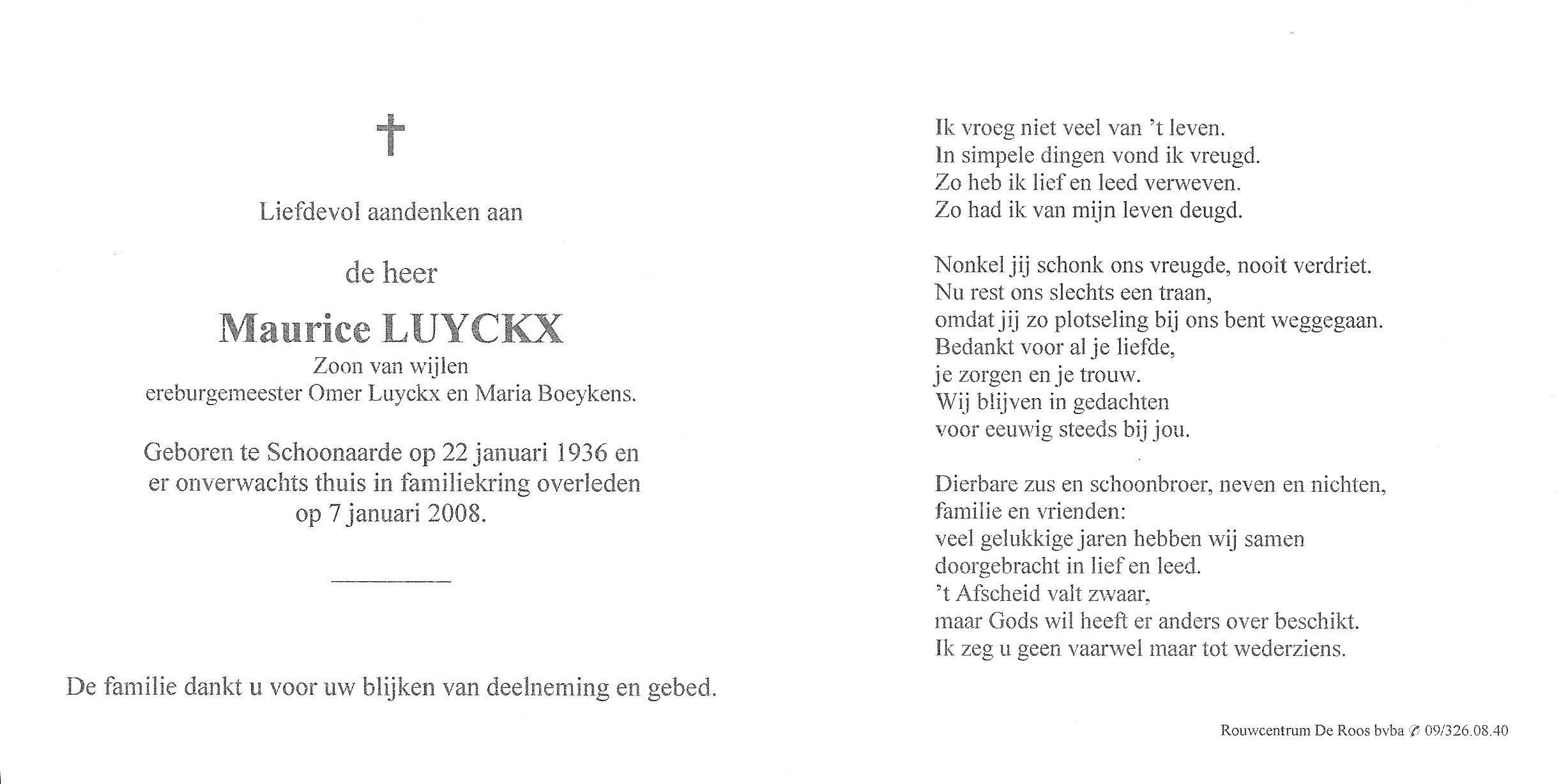 Maurice Luyckx Geboren: 22 januari 1936 31 29 — Schoonaarde Overleden: 7 januari 2008 — Schoonaarde |