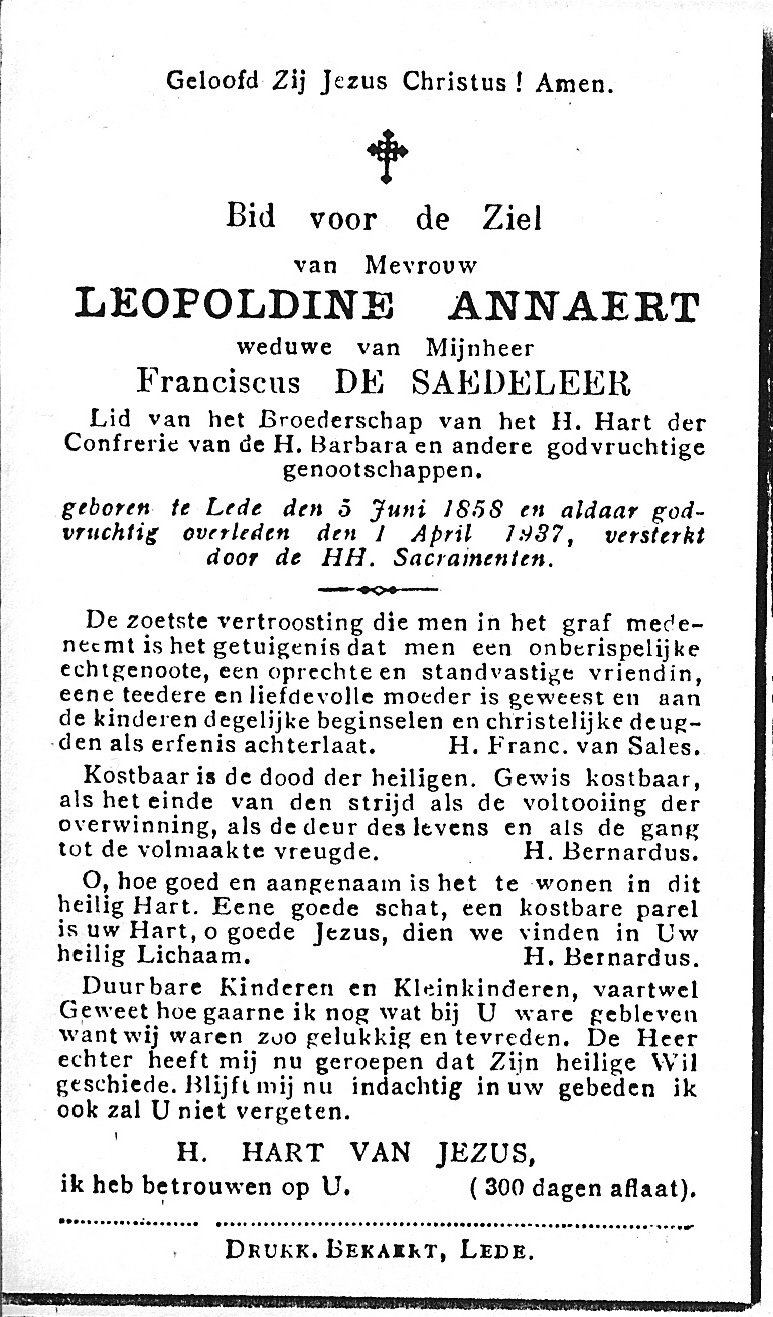 Maria Leopoldina Annaert Geboren: 5 juni 1858 29 29 — Lede Overleden: 1 april 1937 — Lede |