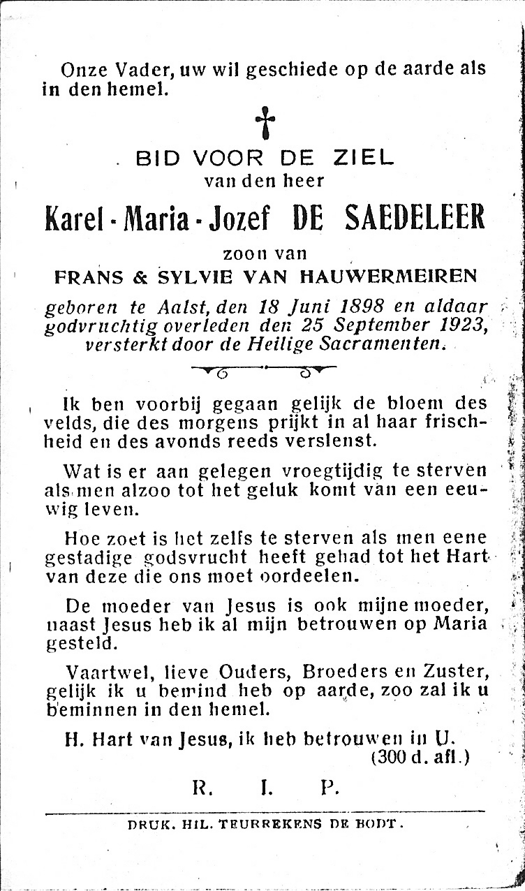 Karel-Maria-Jozef De Saedeleer Geboren: 18 juni 1898 29 25 — Aalst Overleden: 25 september 1923 — Aalst |