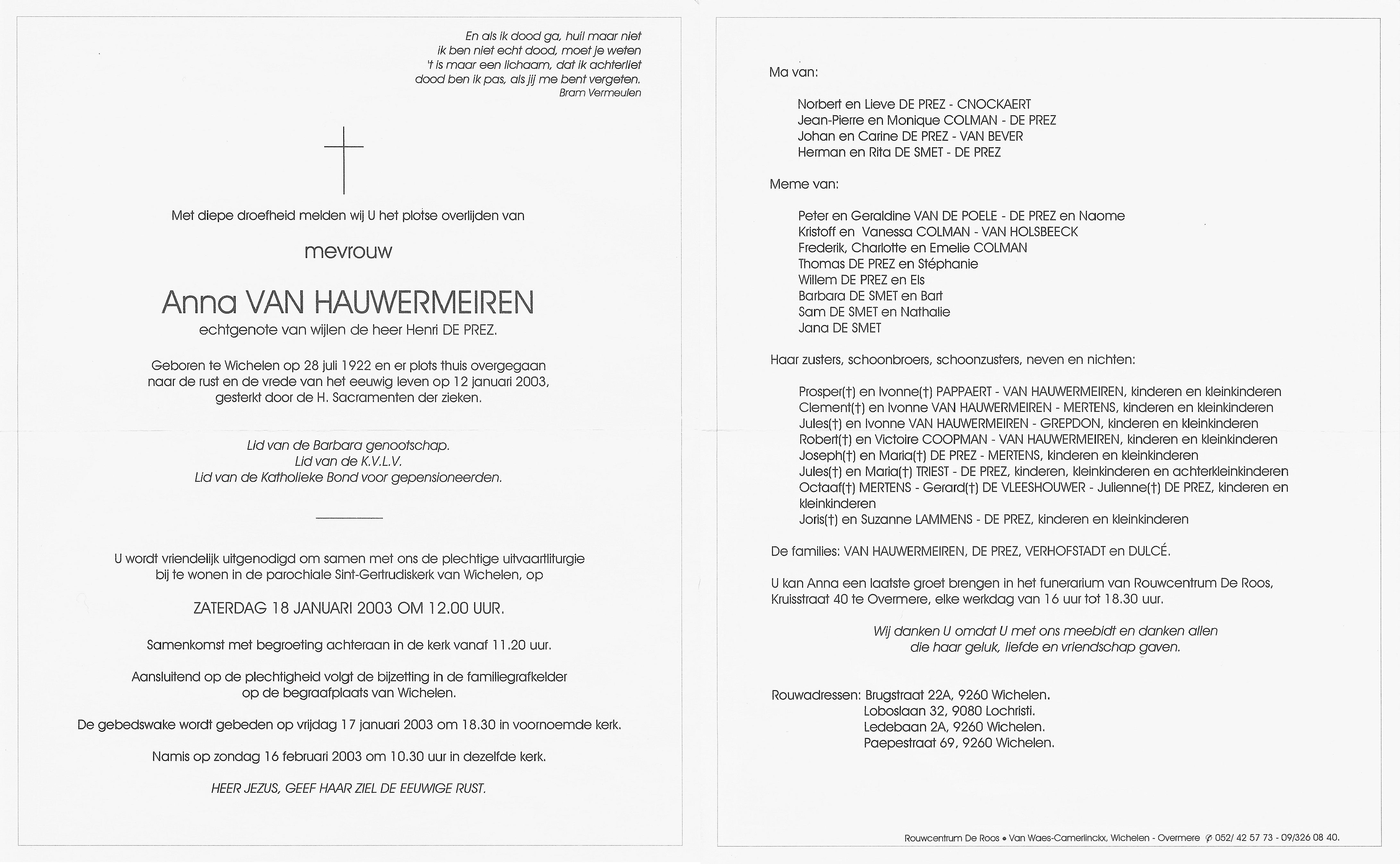 Overlijden van een broer | Jules Richard Van Hauwermeiren 29 november 1982 (Leeftijd 60 jaar) |
