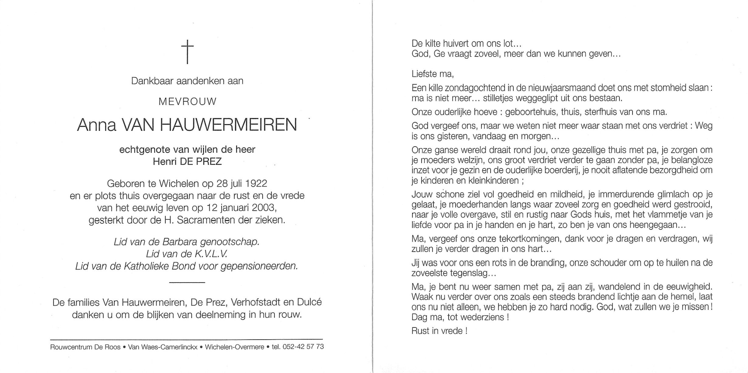 Anna Hortensia Van Hauwermeiren Geboren: 28 juli 1922 42 40 — Wichelen Overleden: 12 januari 2003 — Wichelen |