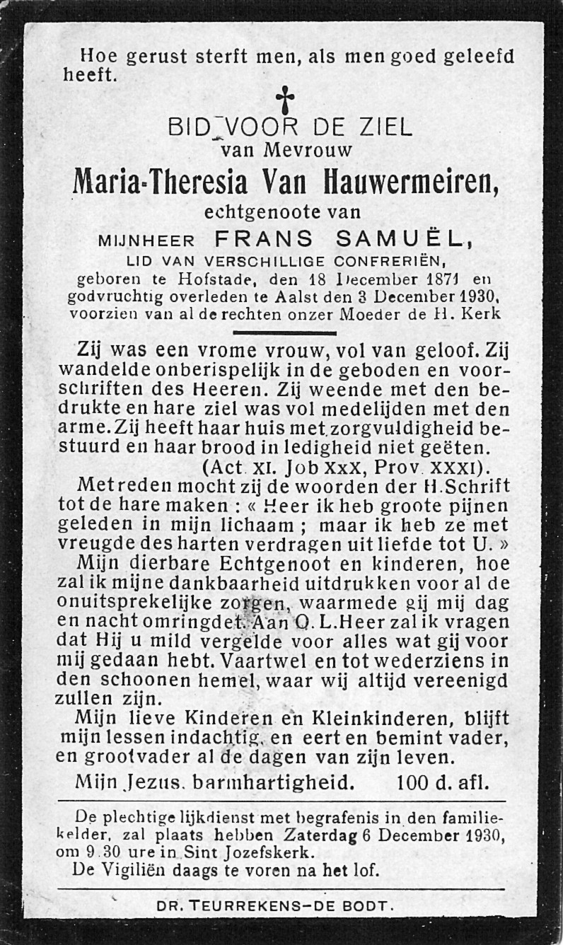 Maria-Theresia Van Hauwermeiren Geboren: 18 december 1871 30 38 — Hofstade Overleden: 3 december 1930 — Aalst |