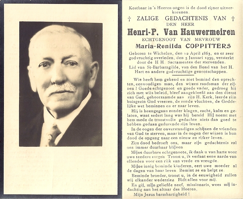 Overlijden van een broer | Petrus Henricus Van Hauwermeiren 5 januari 1939 (Leeftijd 73 jaar) |