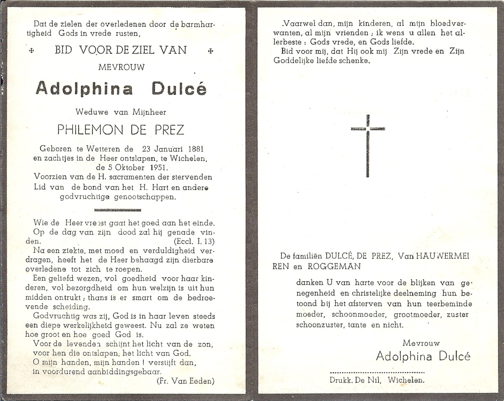 Maria Constantina Adolphina Dulcé Geboren: 23 januari 1881 31 36 — Wetteren Overleden: 5 oktober 1951 — Wichelen |
