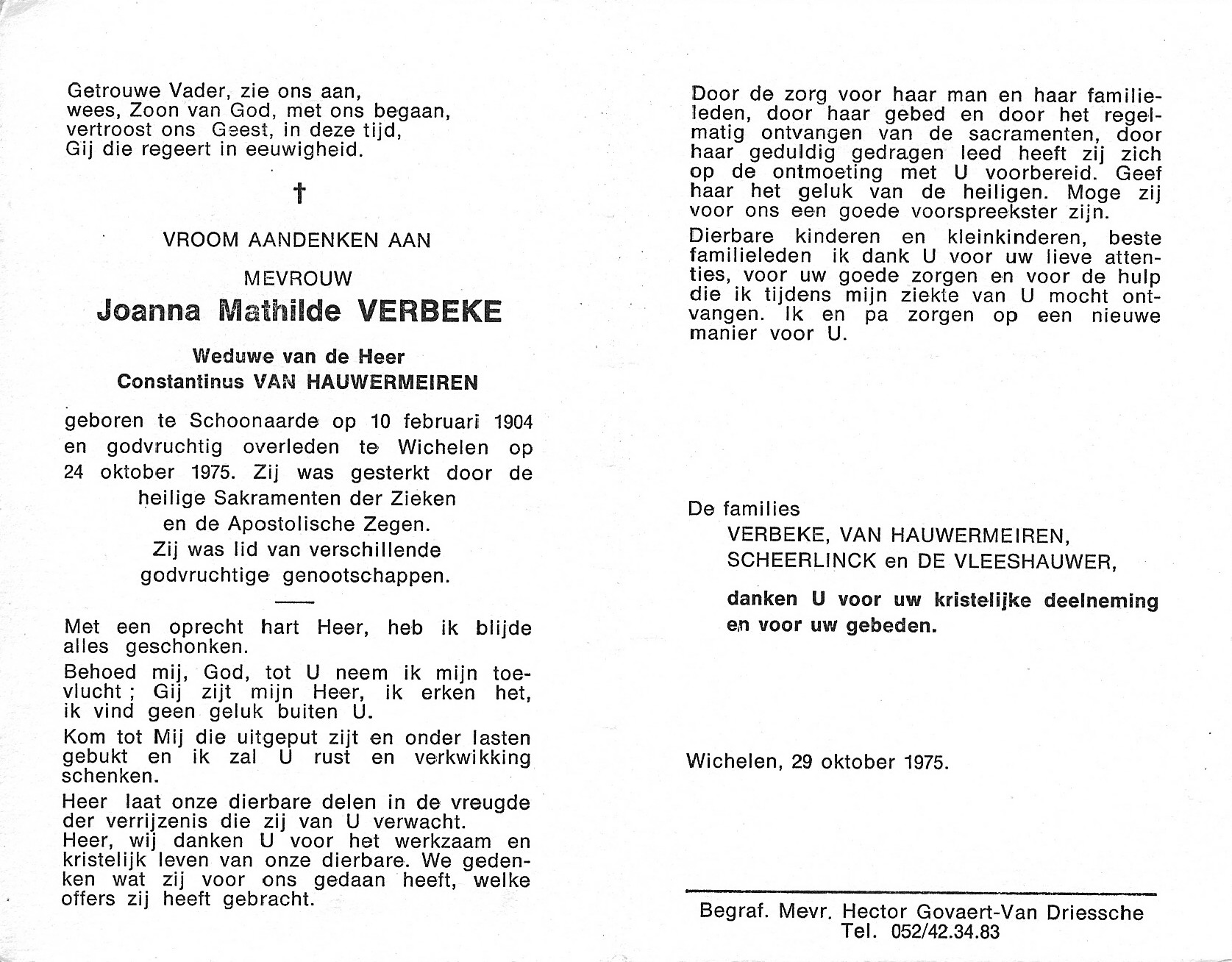 Joanna Mathildis Verbeke Geboren: 10 februari 1904 — Schoonaarde Overleden: 24 oktober 1975 — Wichelen |