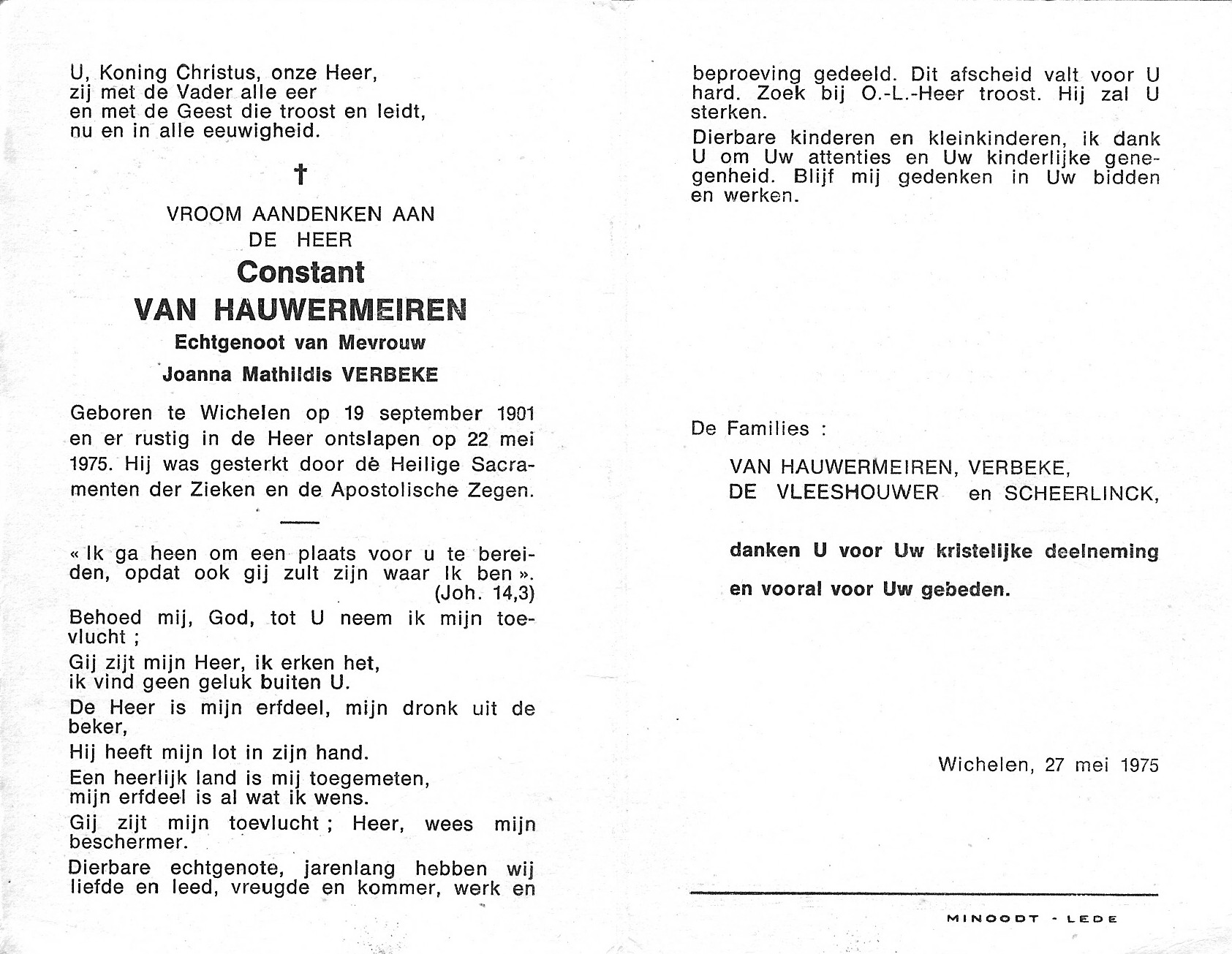 Begrafenis van een echtgenoot | Constantinus Van Hauwermeiren 27 mei 1975 (Leeftijd 71 jaar) |