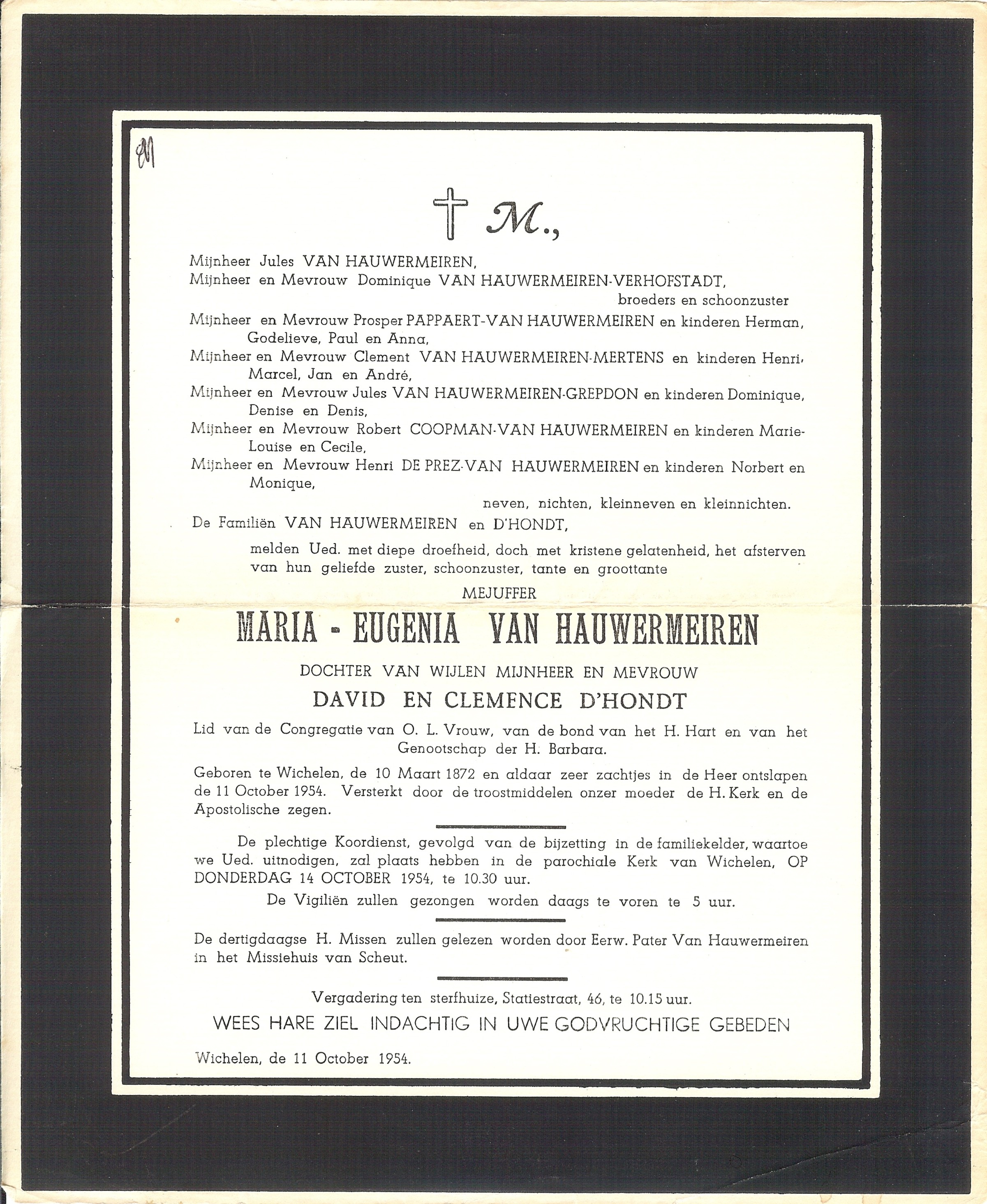 Begrafenis van een zus | Eugenie Marie Van Hauwermeiren 14 oktober 1954 (Leeftijd 74 jaar) |