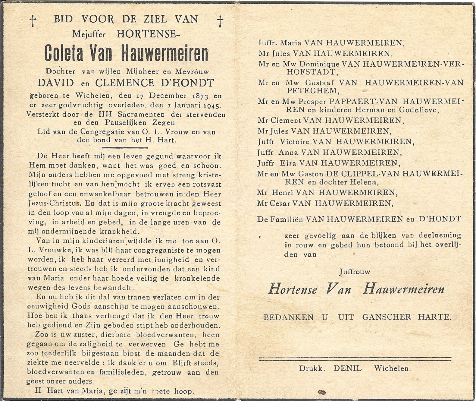 Coleta Hortense Van Hauwermeiren Geboren: 17 december 1873 35 33 — Wichelen Overleden: 1 januari 1945 — Wichelen |