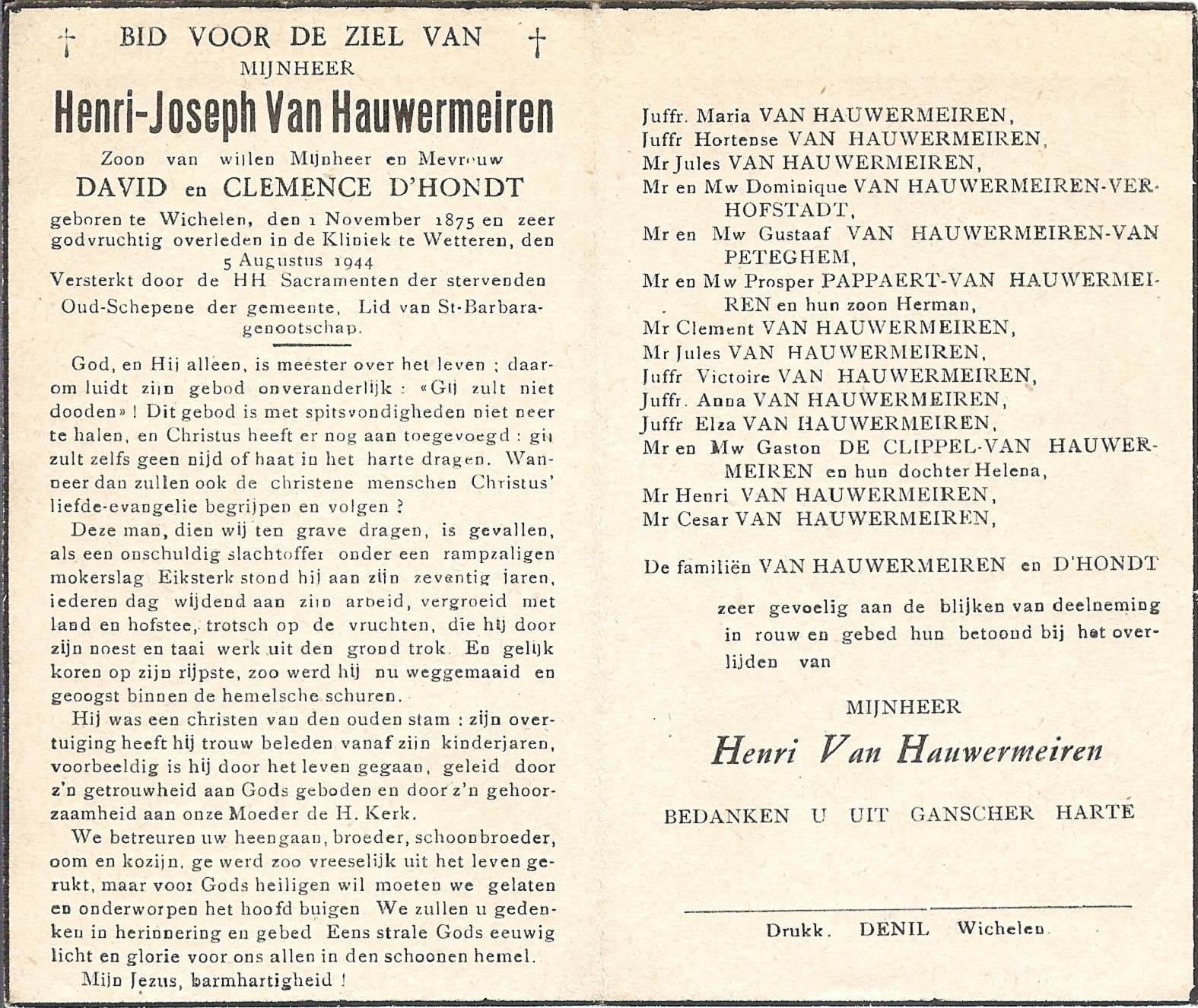 Henricus Josephus Van Hauwermeiren Geboren: 1 november 1875 37 35 — Wichelen Overleden: 5 augustus 1944 — Wichelen |