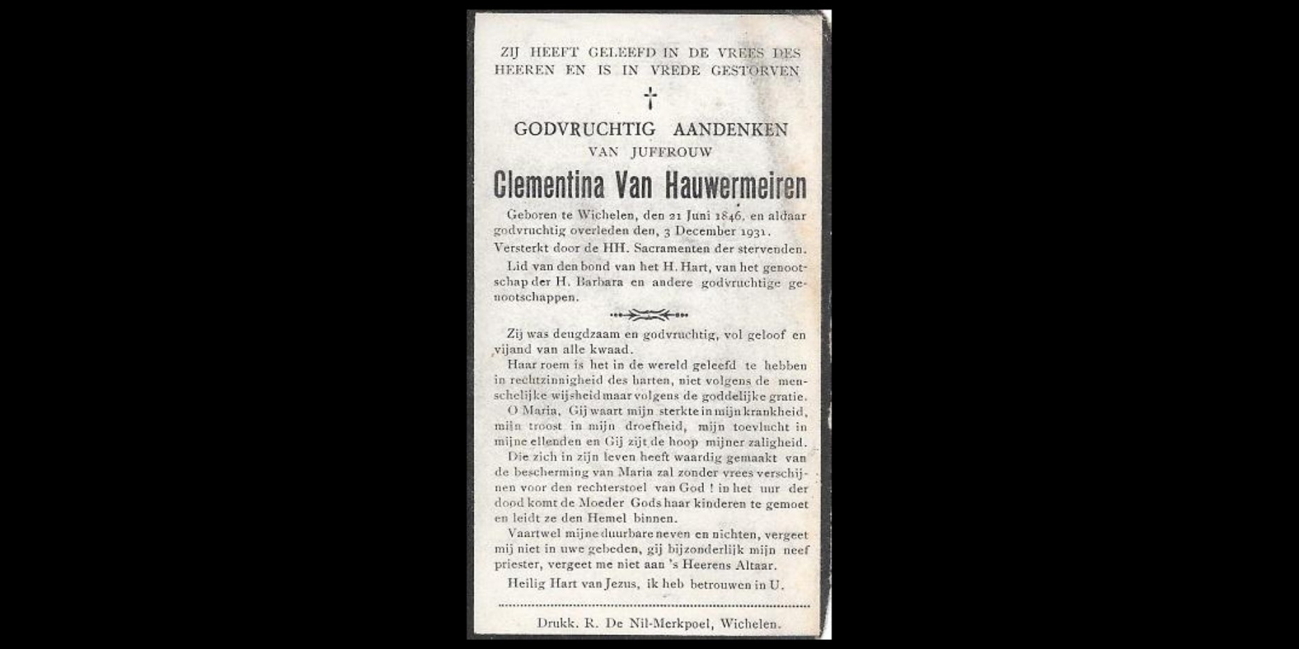 Maria Clementina Van Hauwermeiren Geboren: 21 juni 1846 28 28 — Wichelen Overleden: 3 december 1931 — Wichelen |