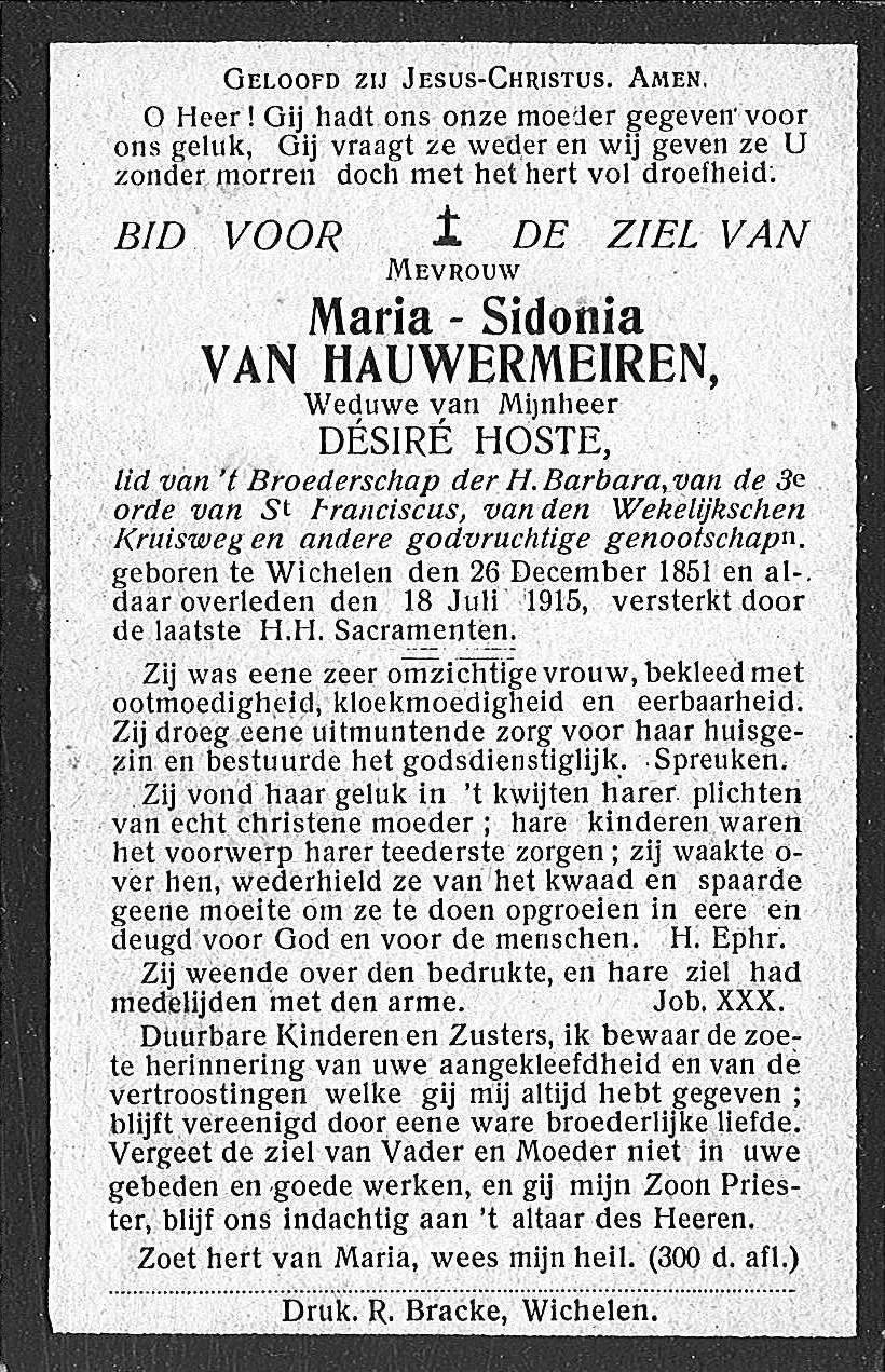 Maria Sidonia Van Hauwermeiren Geboren: 26 december 1851 33 33 — Wichelen Overleden: 18 juli 1915 — Wichelen |