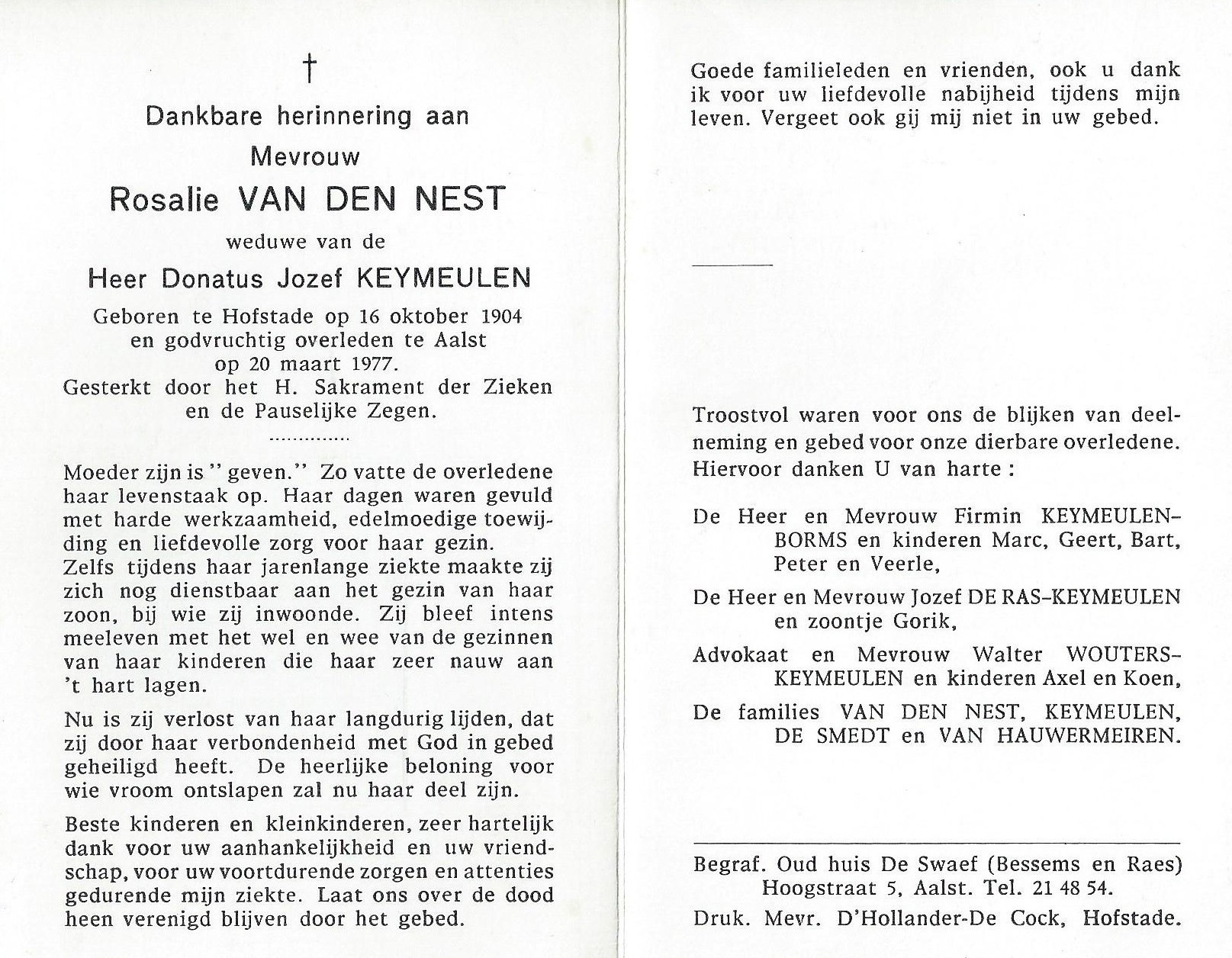Rosalie Van den Nest Geboren: 16 oktober 1904 — Hofstade Overleden: 20 maart 1977 — Aalst |