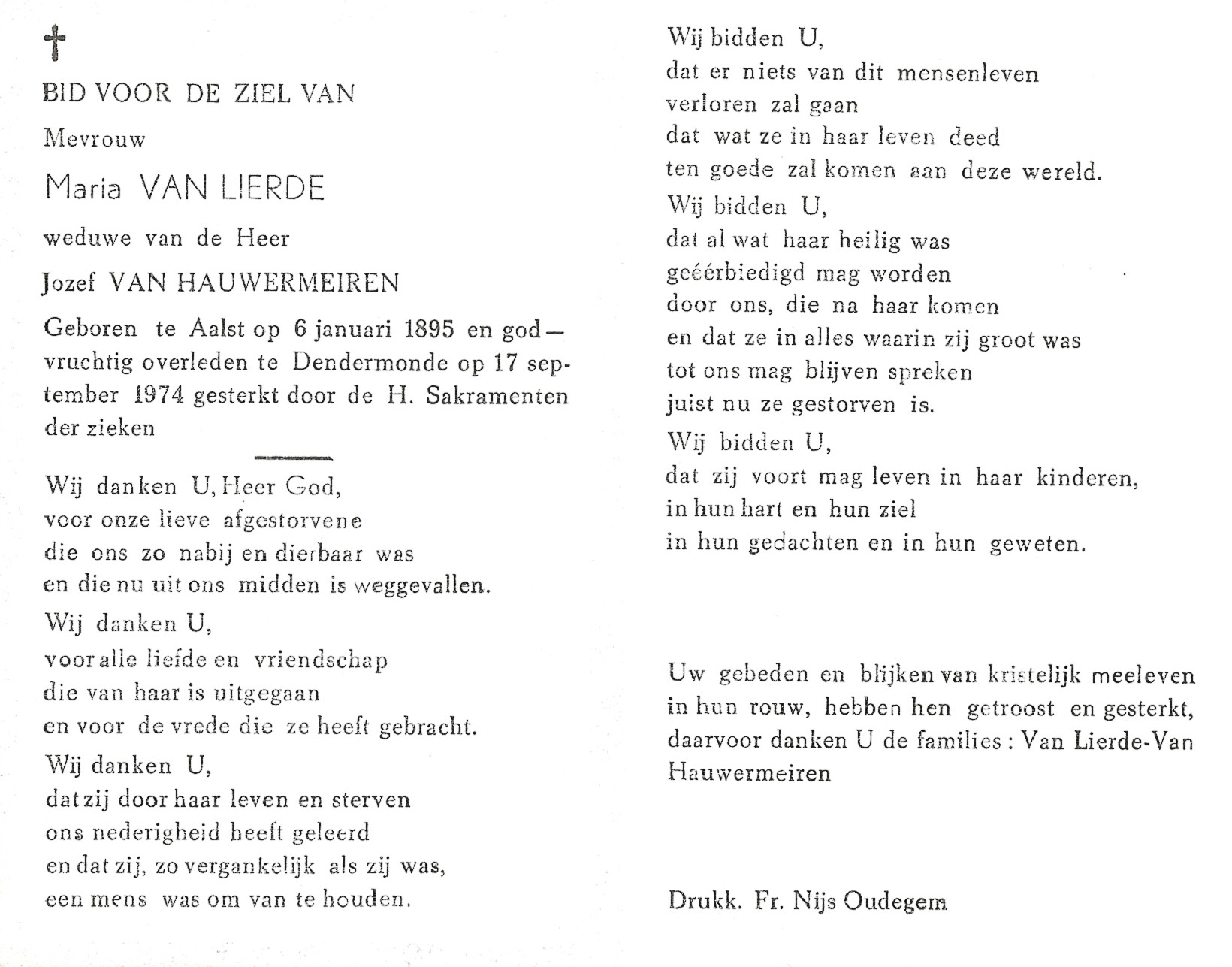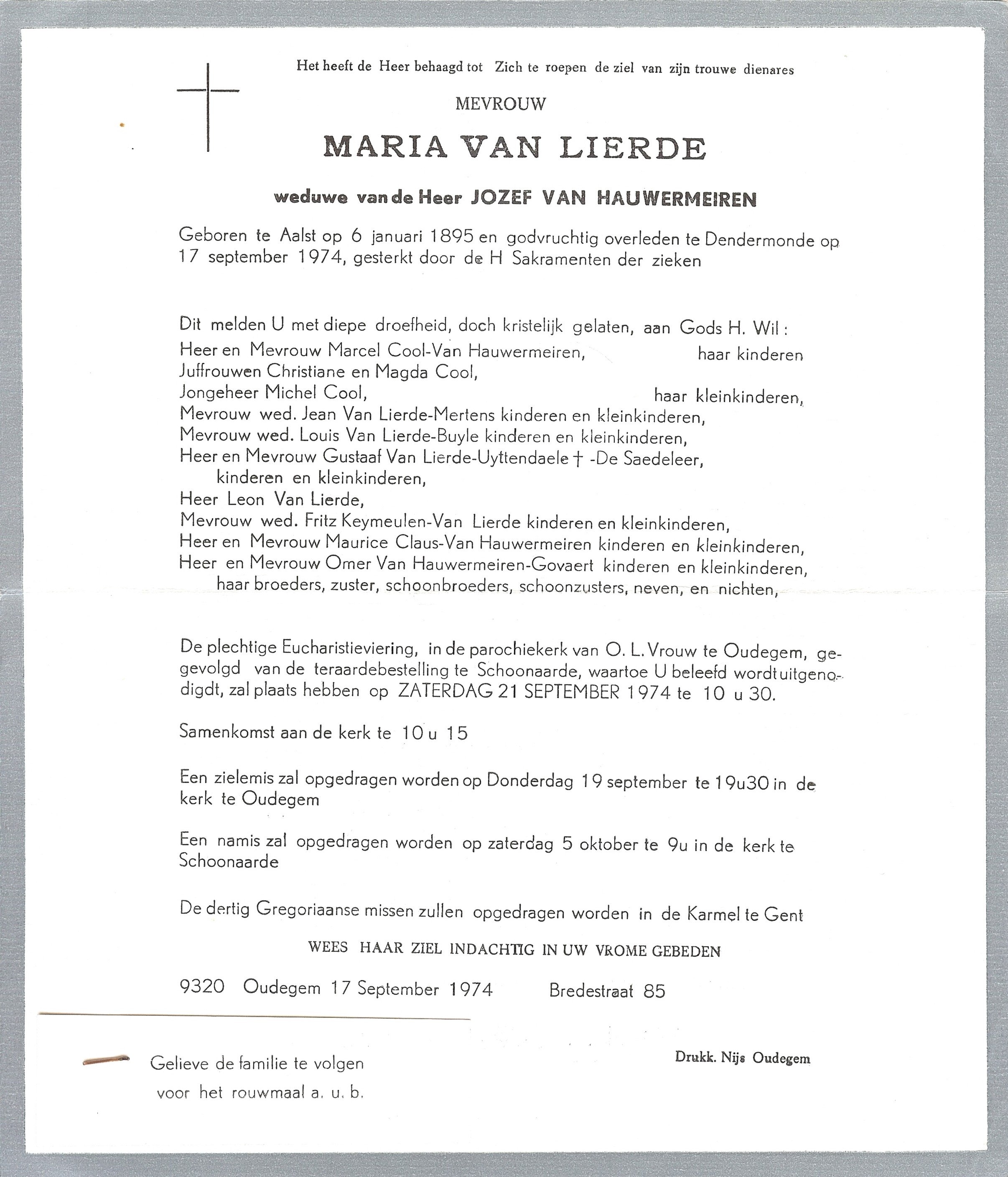 Overlijden van een echtgenoot | Jozef Van Hauwermeiren 29 september 1970 (Leeftijd 75 jaar) |