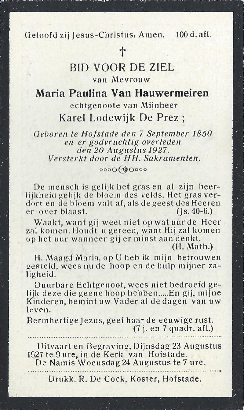 Maria Paulina Van Hauwermeiren Geboren: 7 september 1850 32 23 — Hofstade Overleden: 20 augustus 1927 — Hofstade |