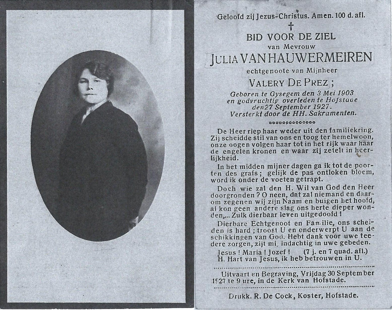 Julia Van Hauwermeiren Geboren: 3 mei 1903 85 76 — Gijzegem Overleden: 27 september 1927 — Hofstade |