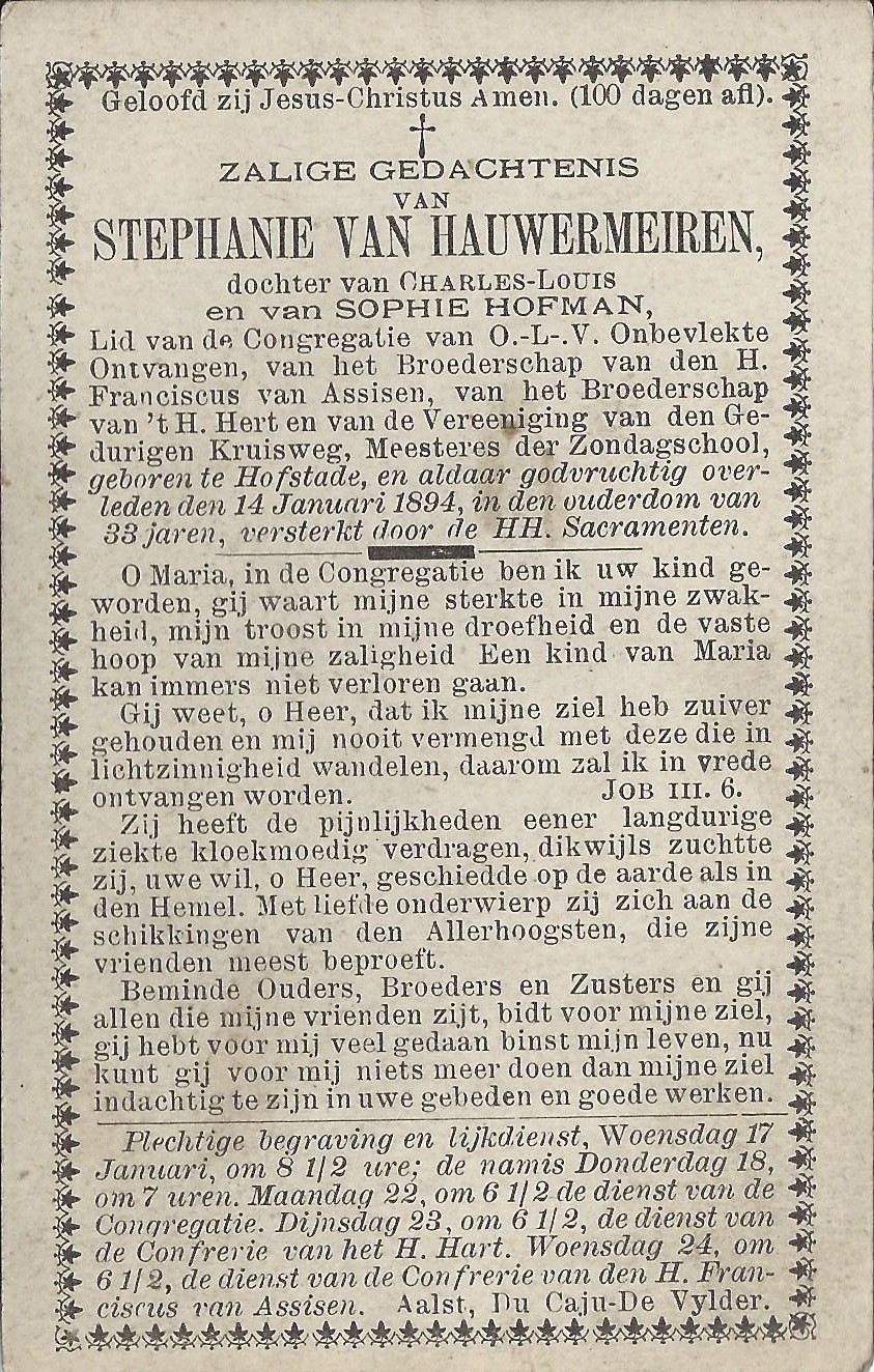 Stephania Van Hauwermeiren Geboren: 23 november 1860 42 33 — Hofstade Overleden: 14 januari 1894 — Hofstade |