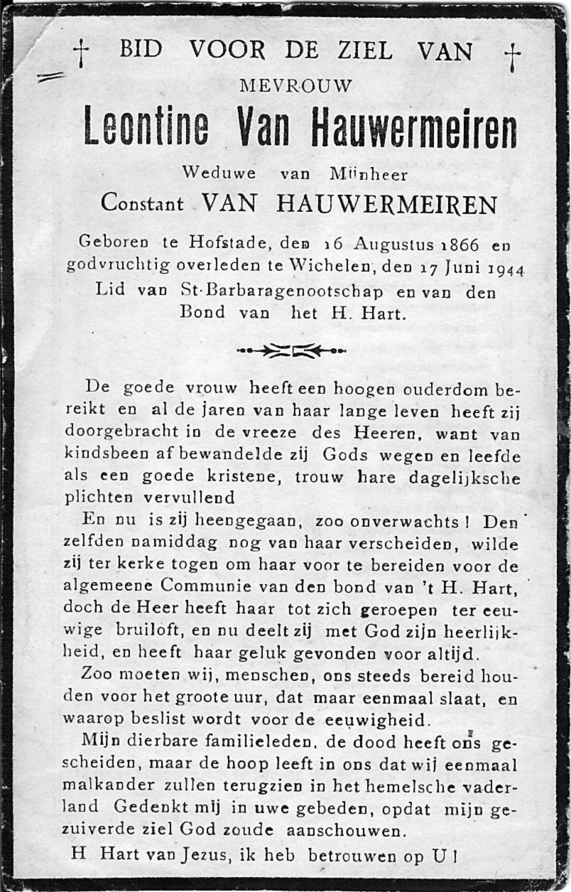 Leontina Van Hauwermeiren Geboren: 16 augustus 1866 48 39 — Hofstade Overleden: 17 juni 1944 — Wichelen |