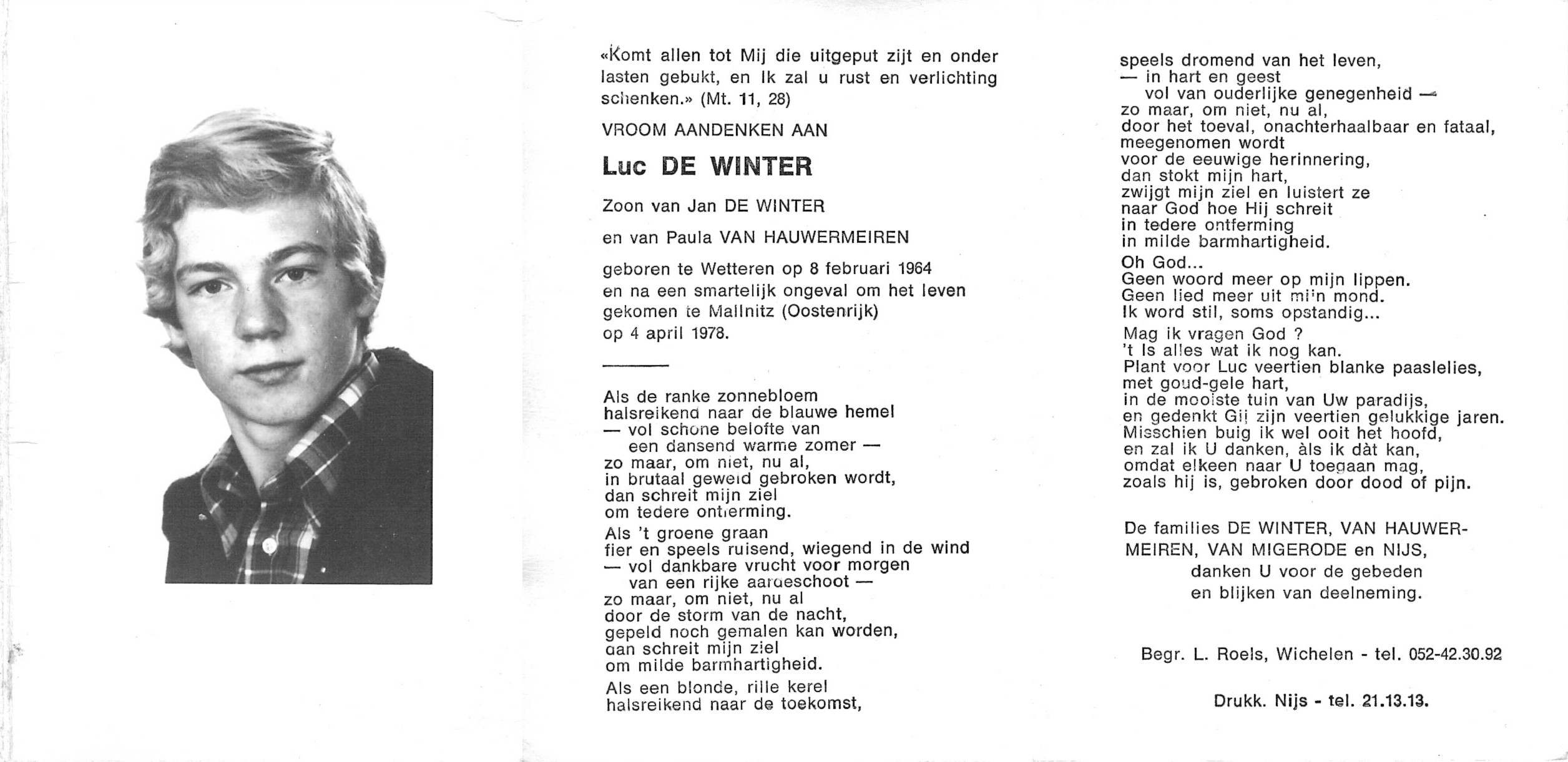 Overlijden van een zoon | Luc De Winter 4 april 1978 (Leeftijd 44 jaar) |