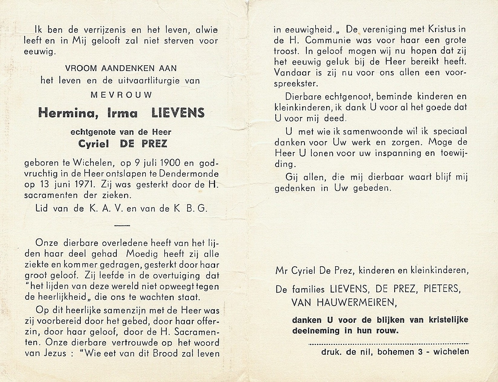 Overlijden van een echtgenote | Hermine Irma Lievens 13 juni 1971 (Leeftijd 69 jaar) |