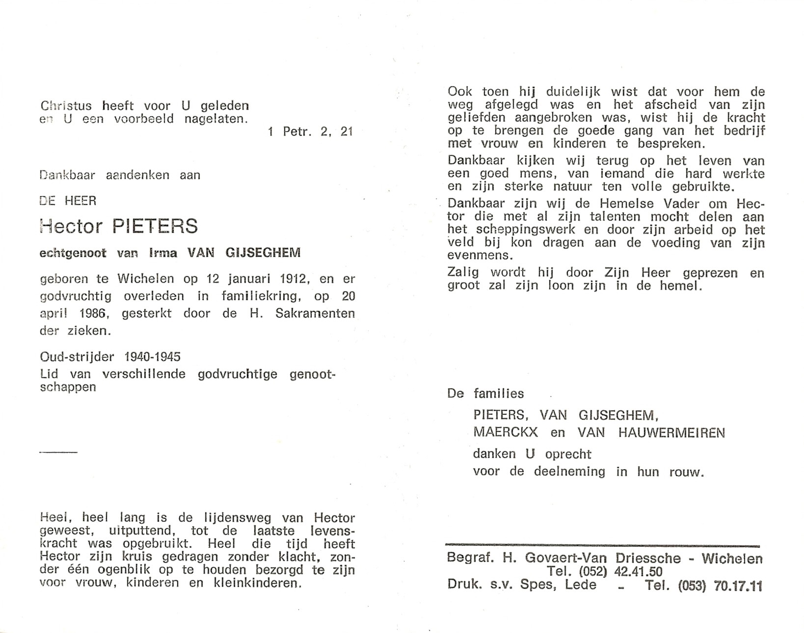 Hector Pieters Geboren: 12 januari 1912 — Wichelen Overleden: 20 april 1986 — Wichelen |