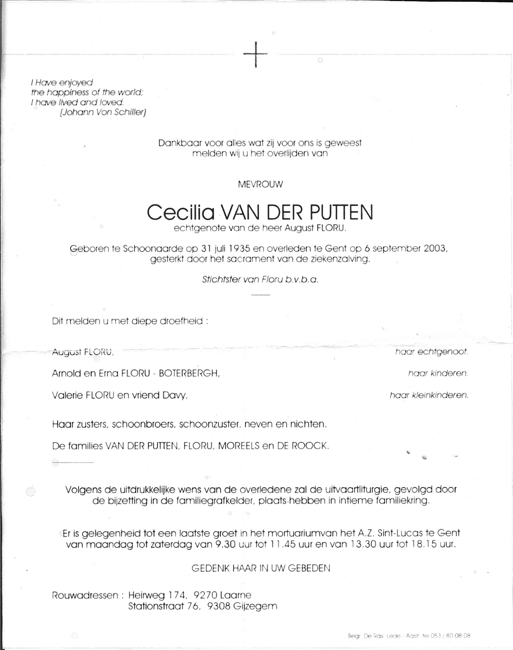 Overlijden van een echtgenote | Cecilia Van der Putten 6 september 2003 |