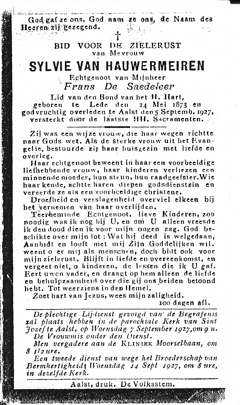 Sylvie Van Hauwermeiren Geboren: 14 mei 1873 38 34 — Lede Overleden: 5 september 1927 — Aalst |