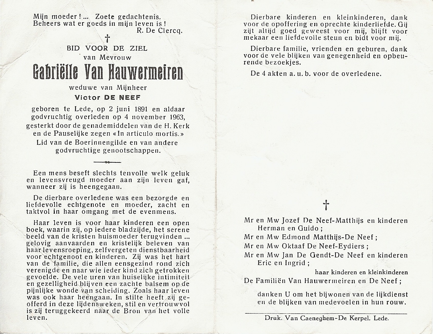 Adelaide Gabriella Van Hauwermeiren Geboren: 2 juni 1891 33 36 — Lede Overleden: 4 november 1963 — Lede |