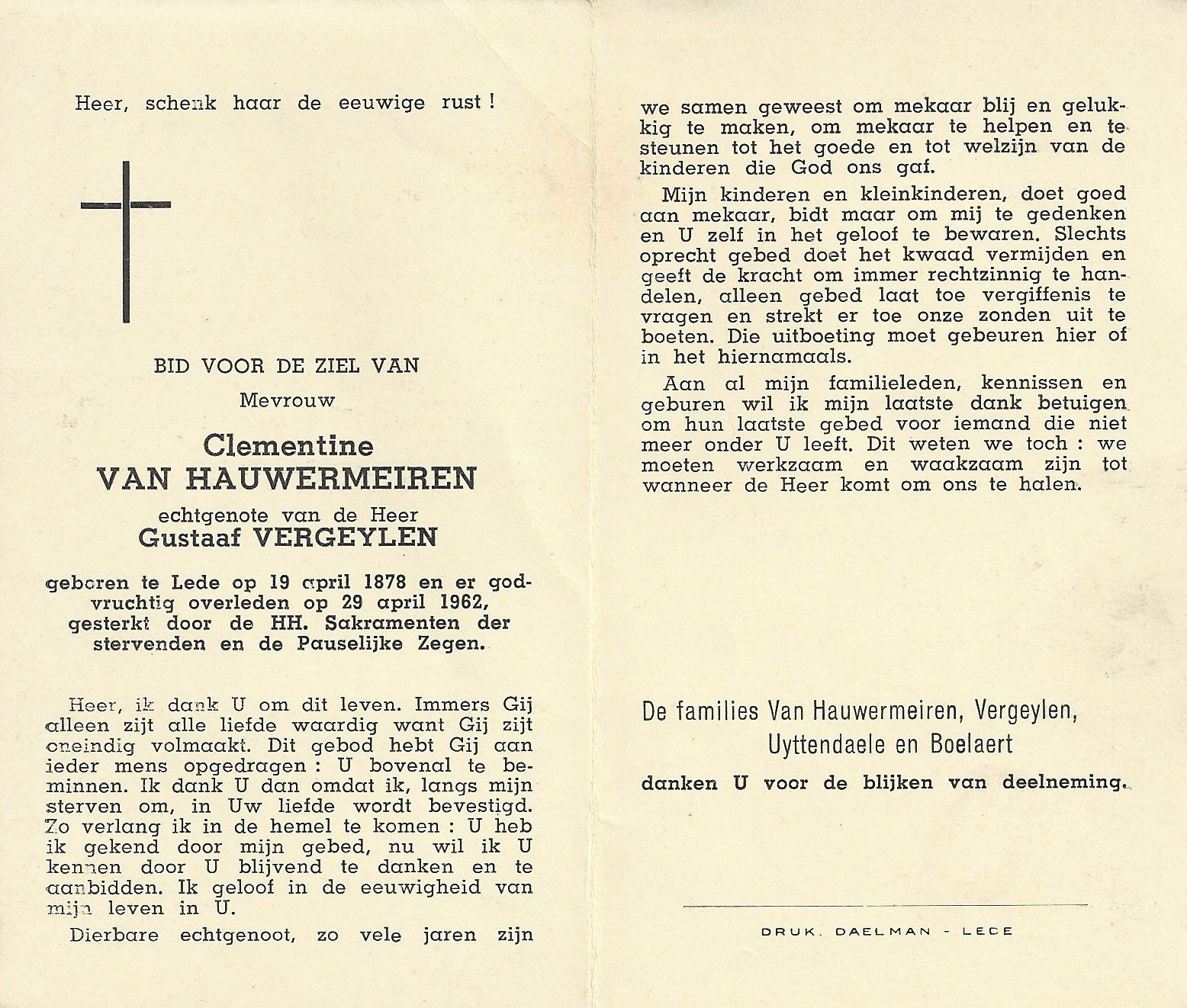 Clementina Van Hauwermeiren Geboren: 19 april 1878 37 30 — Lede Overleden: 29 april 1962 — Lede |