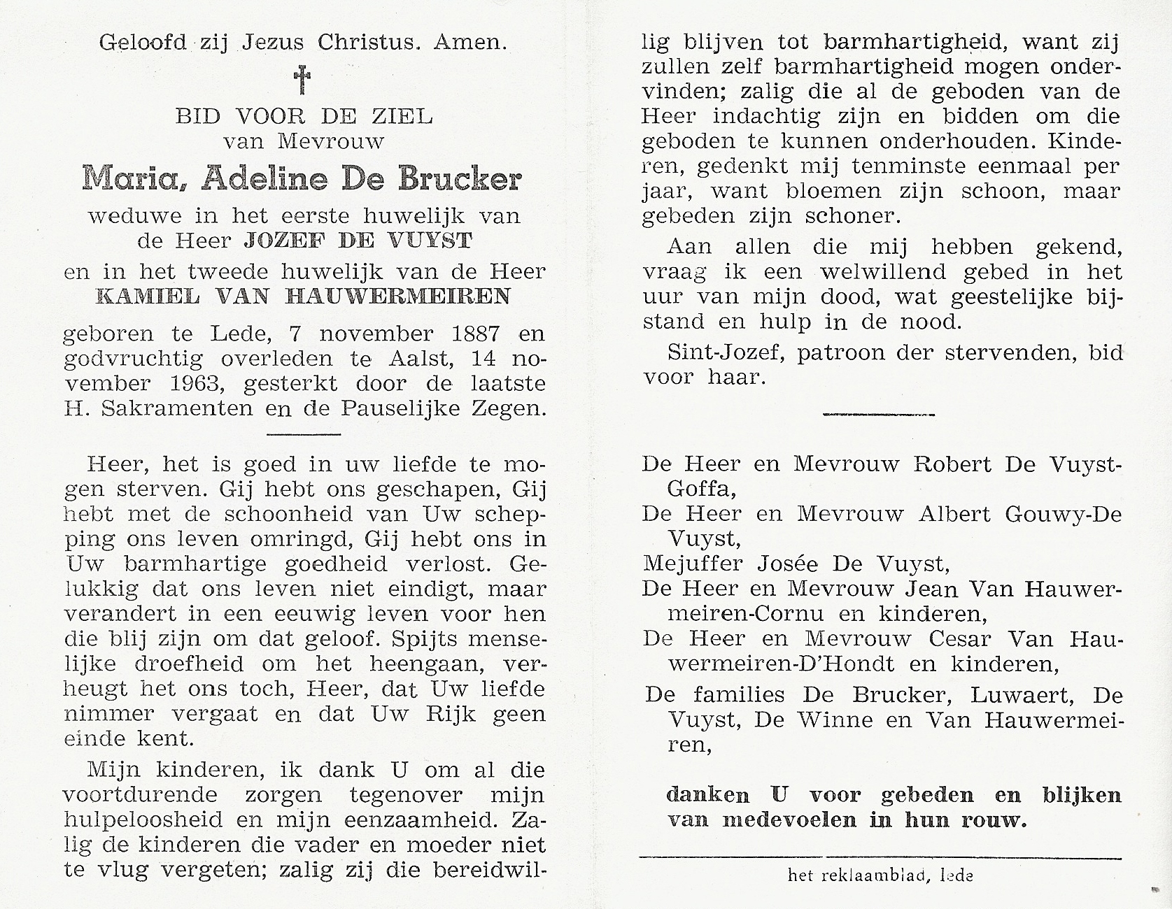 Maria Adeline De Brucker Geboren: 7 november 1887 — Lede Overleden: 14 november 1963 — Aalst |