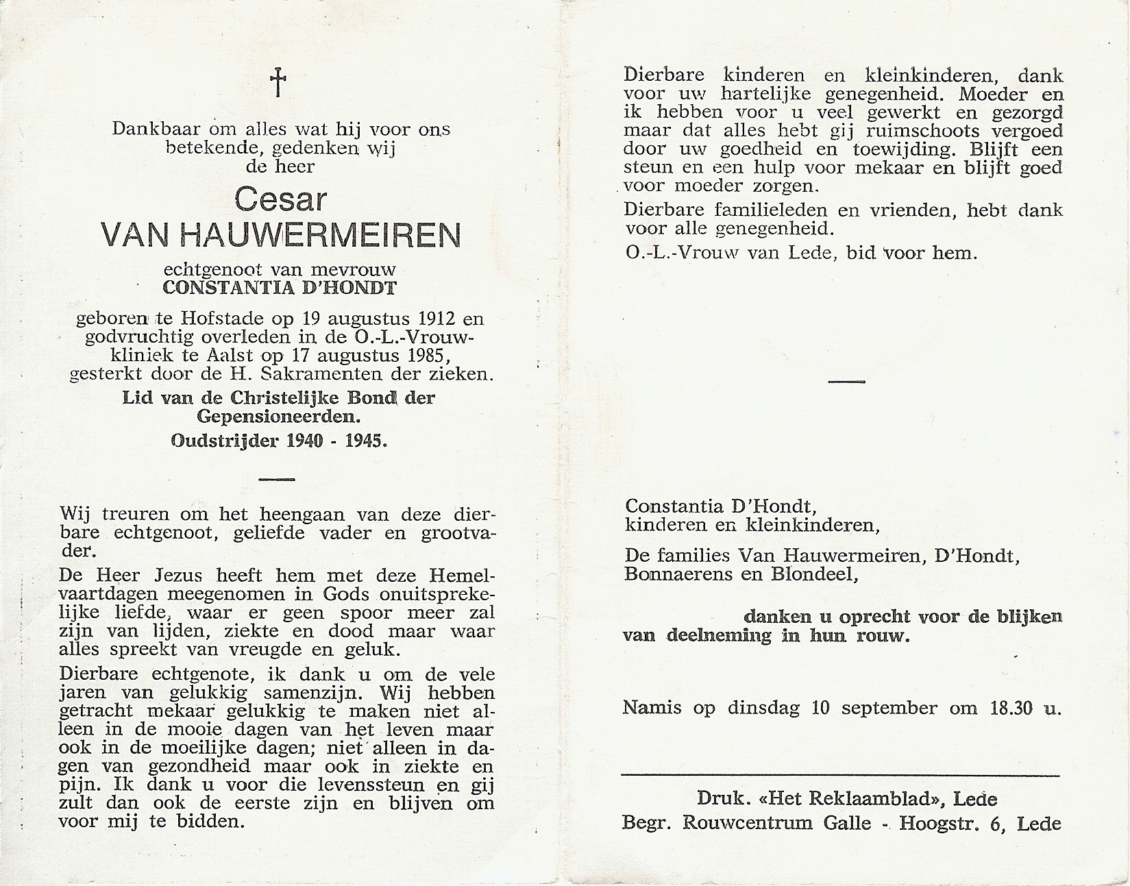 Cesar Van Hauwermeiren Geboren: 19 augustus 1912 28 28 — Hofstade Overleden: 17 augustus 1985 — Aalst |