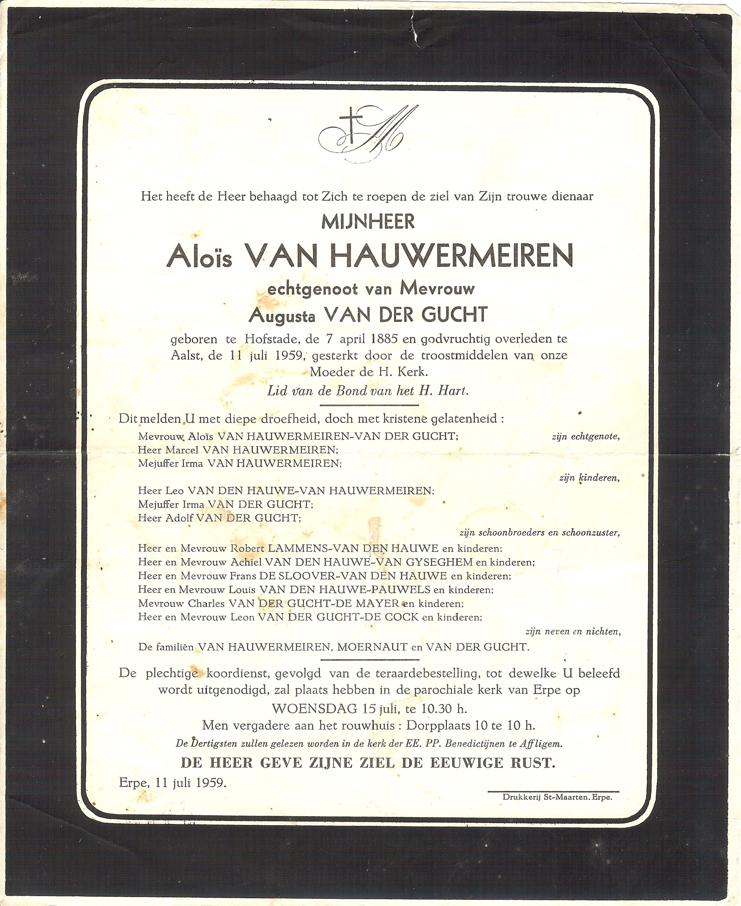 Begrafenis van een echtgenoot | Aloysius Franciscus Van Hauwermeiren 15 juli 1959 (Leeftijd 78 jaar) |