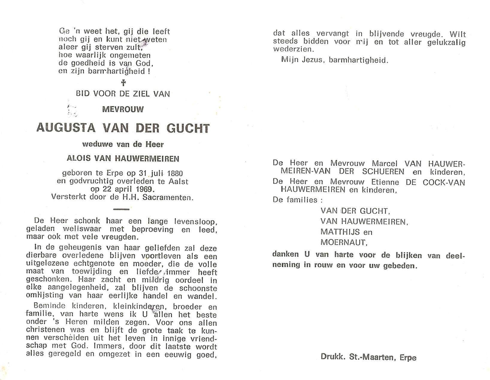 Augusta Van Der Gucht Geboren: 31 juli 1880 — Erpe Overleden: 22 april 1969 — Aalst |