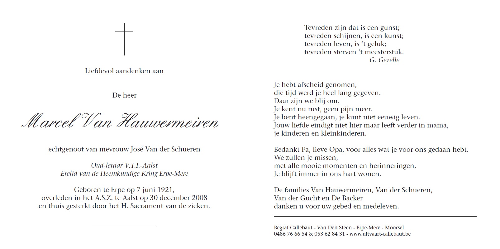 Overlijden van een broer | Marcel Van Hauwermeiren 30 december 2008 (Leeftijd 83 jaar) |