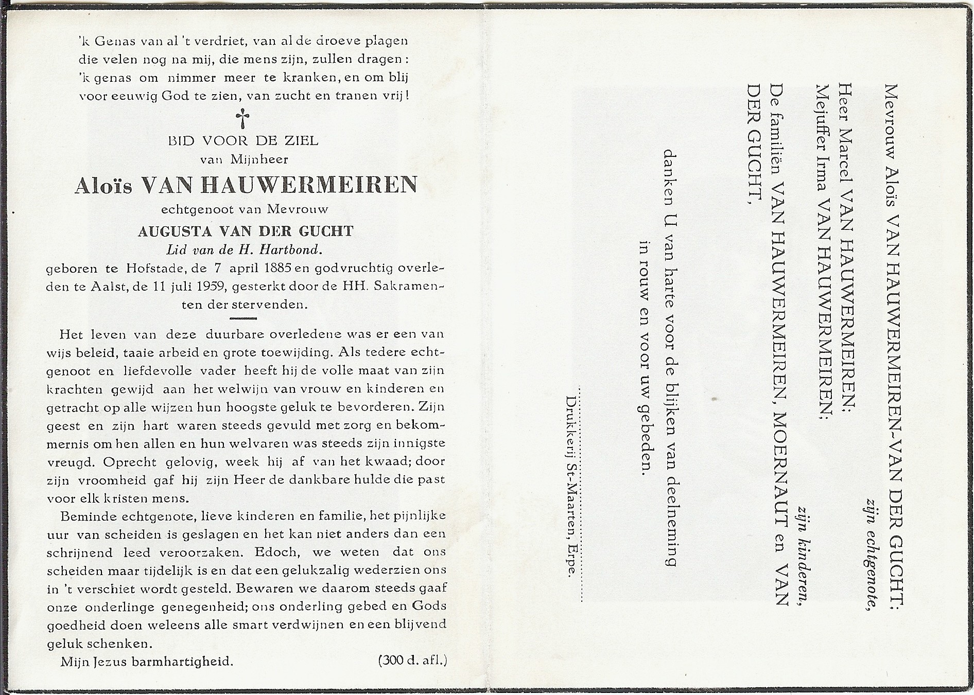 Aloysius Franciscus Van Hauwermeiren Geboren: 7 april 1885 44 45 — Hofstade Overleden: 11 juli 1959 — Aalst |