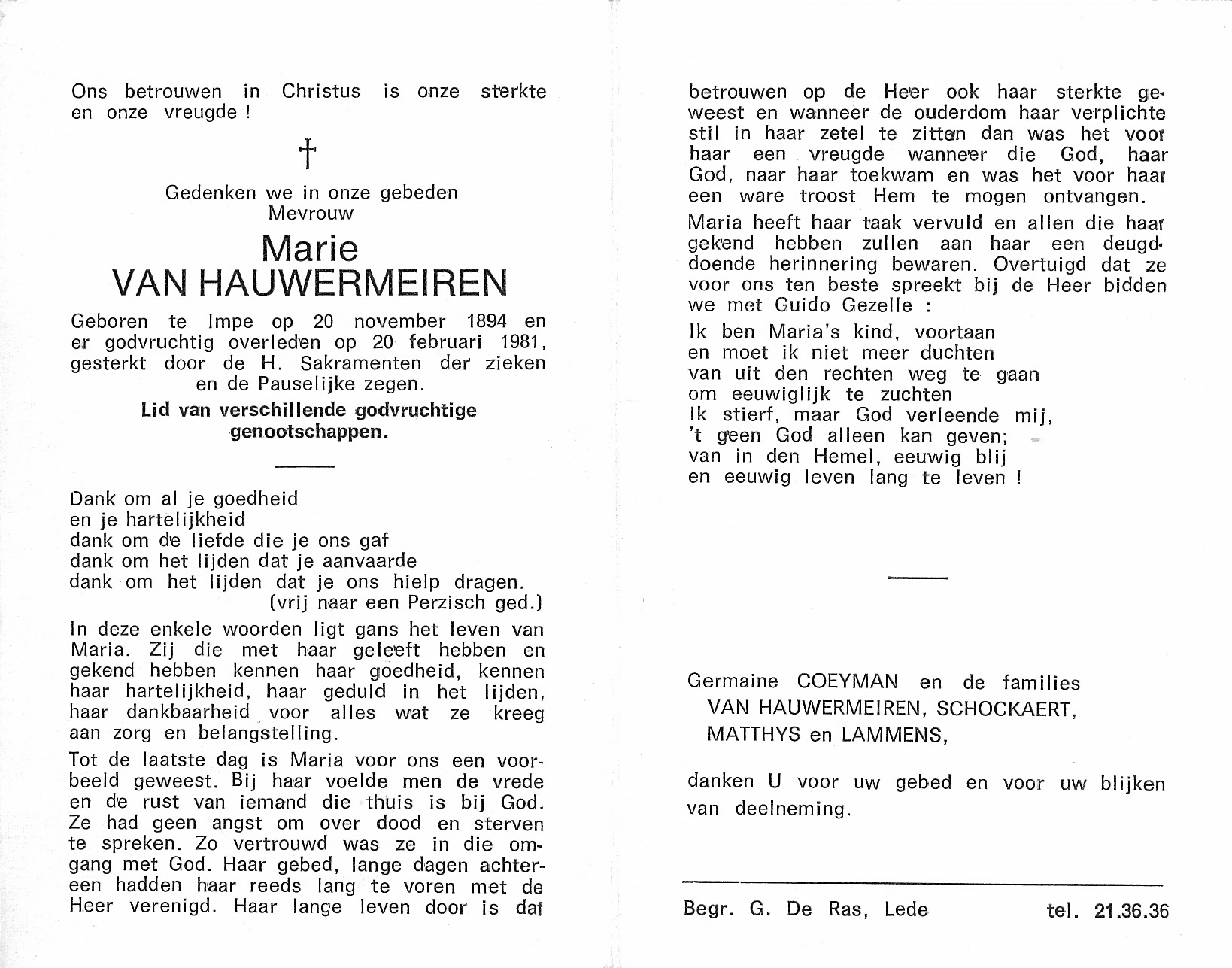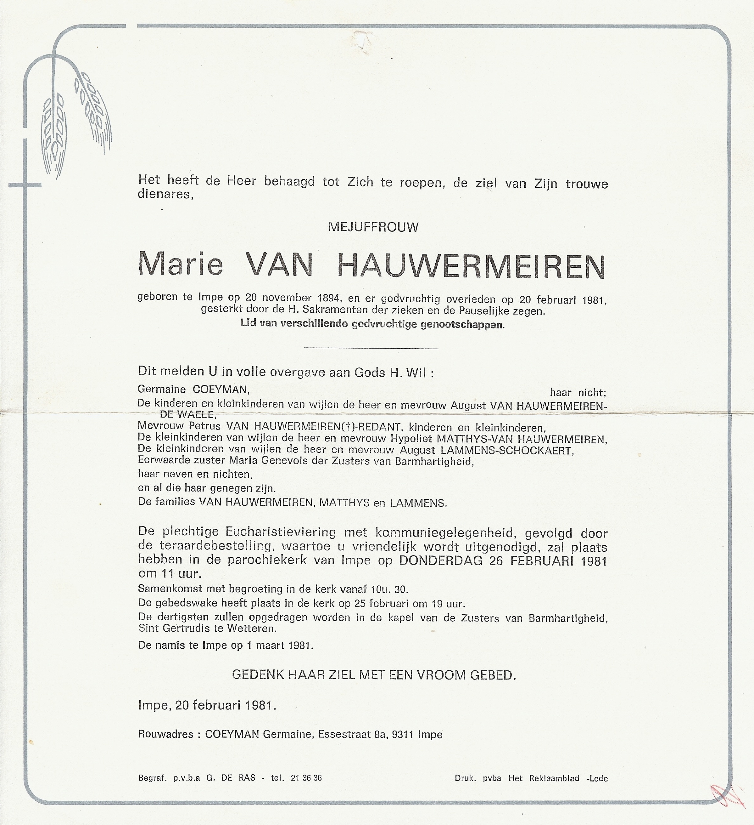 Maria Stephania Van Hauwermeiren Geboren: 20 november 1894 39 39 — Impe Overleden: 20 februari 1981 — Impe |