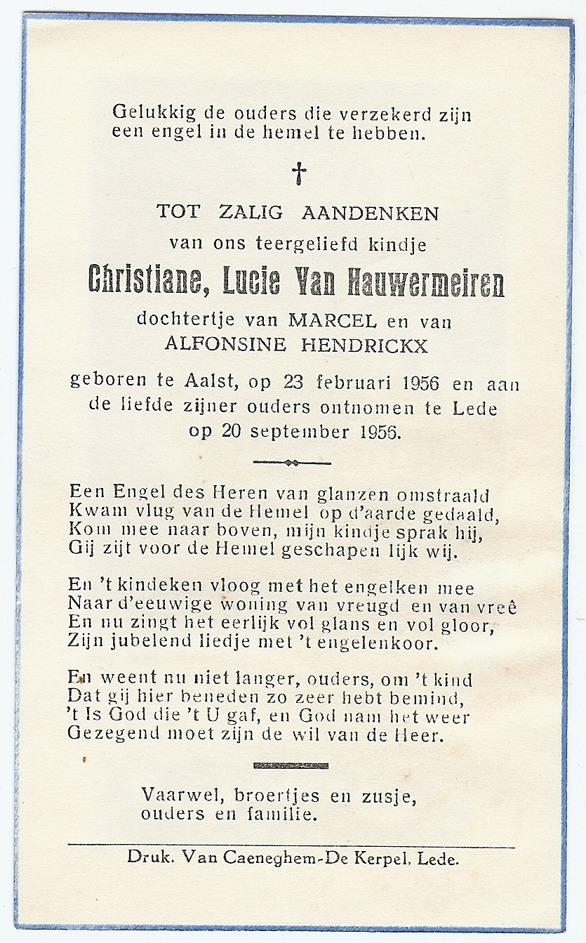 Overlijden van een kleindochter | Christiane Lucie Van Hauwermeiren 20 september 1956 (Leeftijd 74 jaar) |