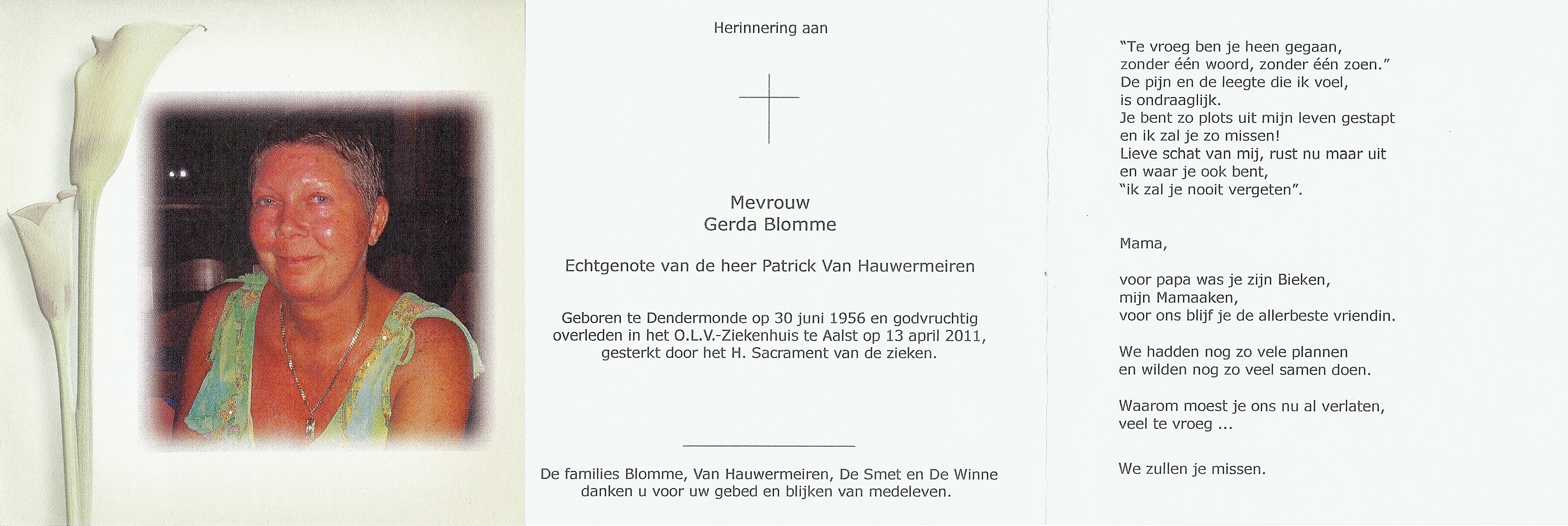 Gerda Blomme Geboren: 30 juni 1956 — Dendermonde Overleden: 13 april 2011 — Aalst |