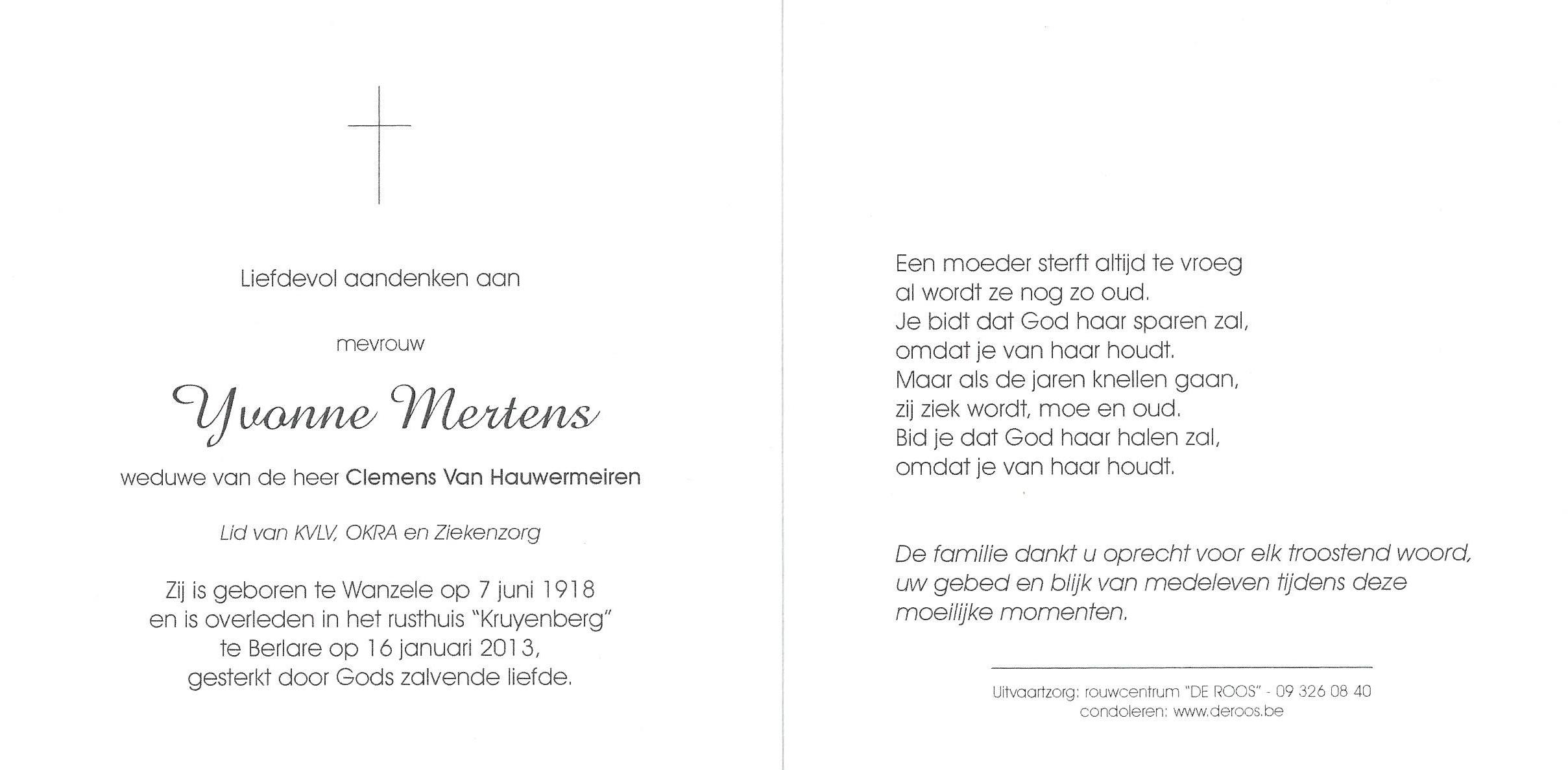 Yvonne Mertens Geboren: 7 juni 1918 — Wanzele Overleden: 16 januari 2013 — Berlare |
