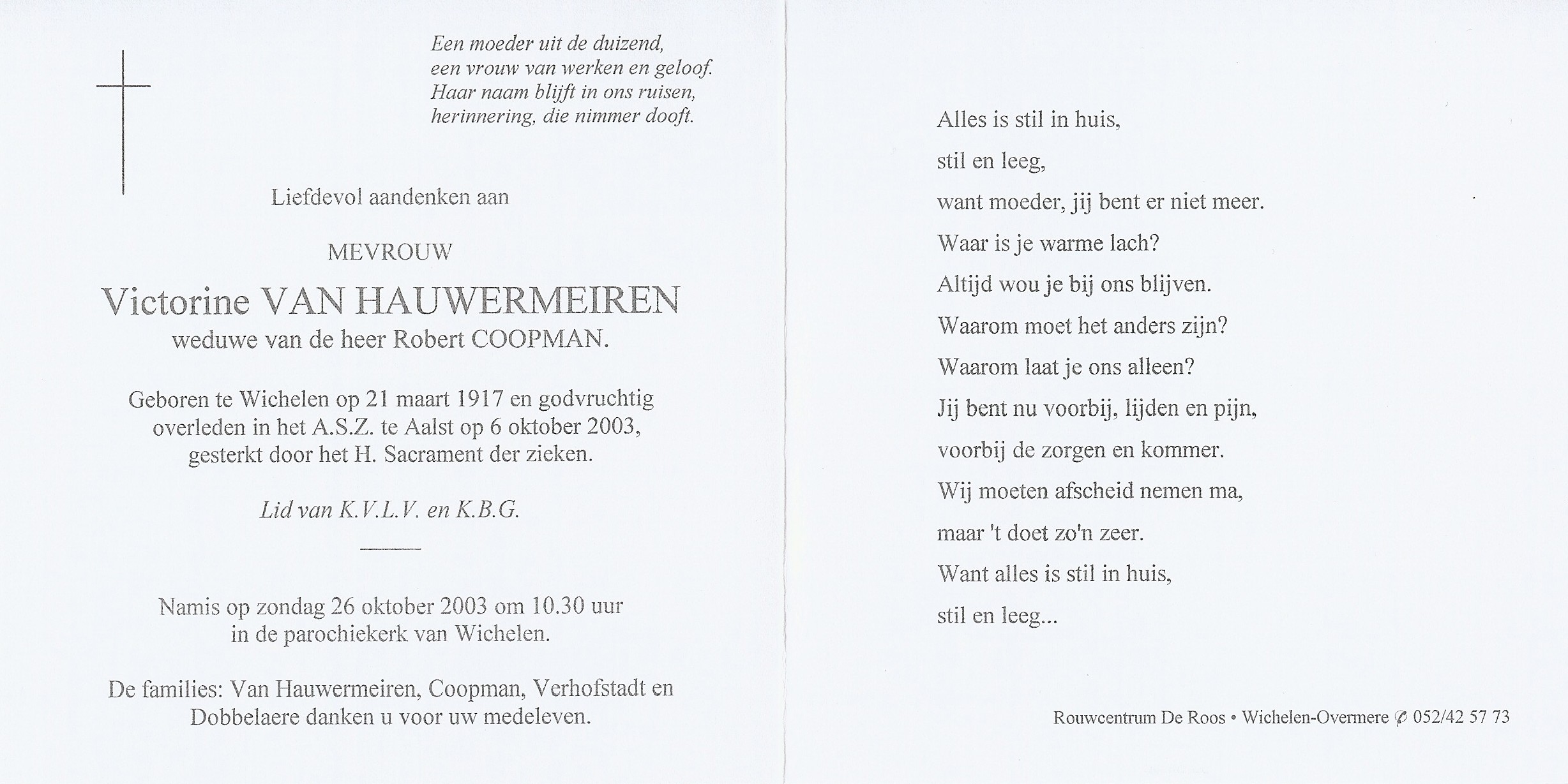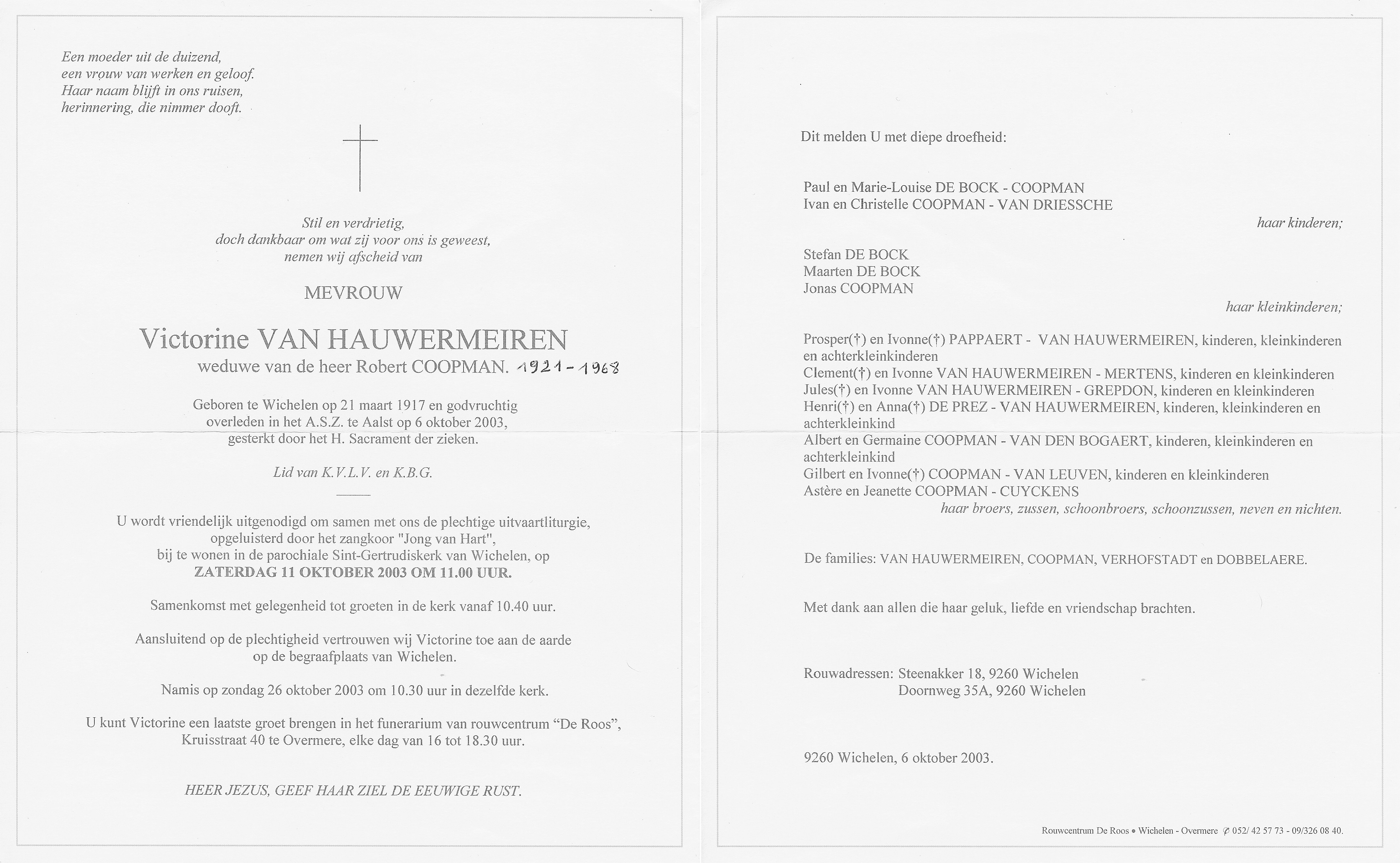 Victorina Maria Henrica Van Hauwermeiren Geboren: 21 maart 1917 37 35 — Wichelen Overleden: 6 oktober 2003 — Aalst |