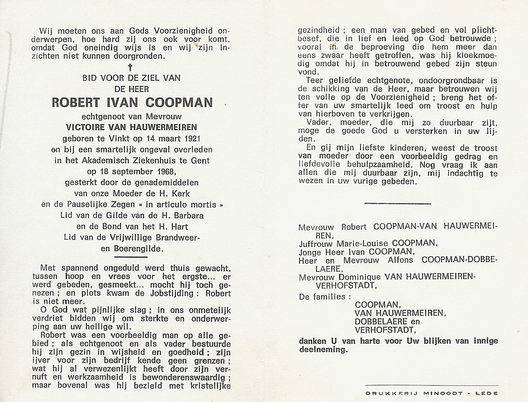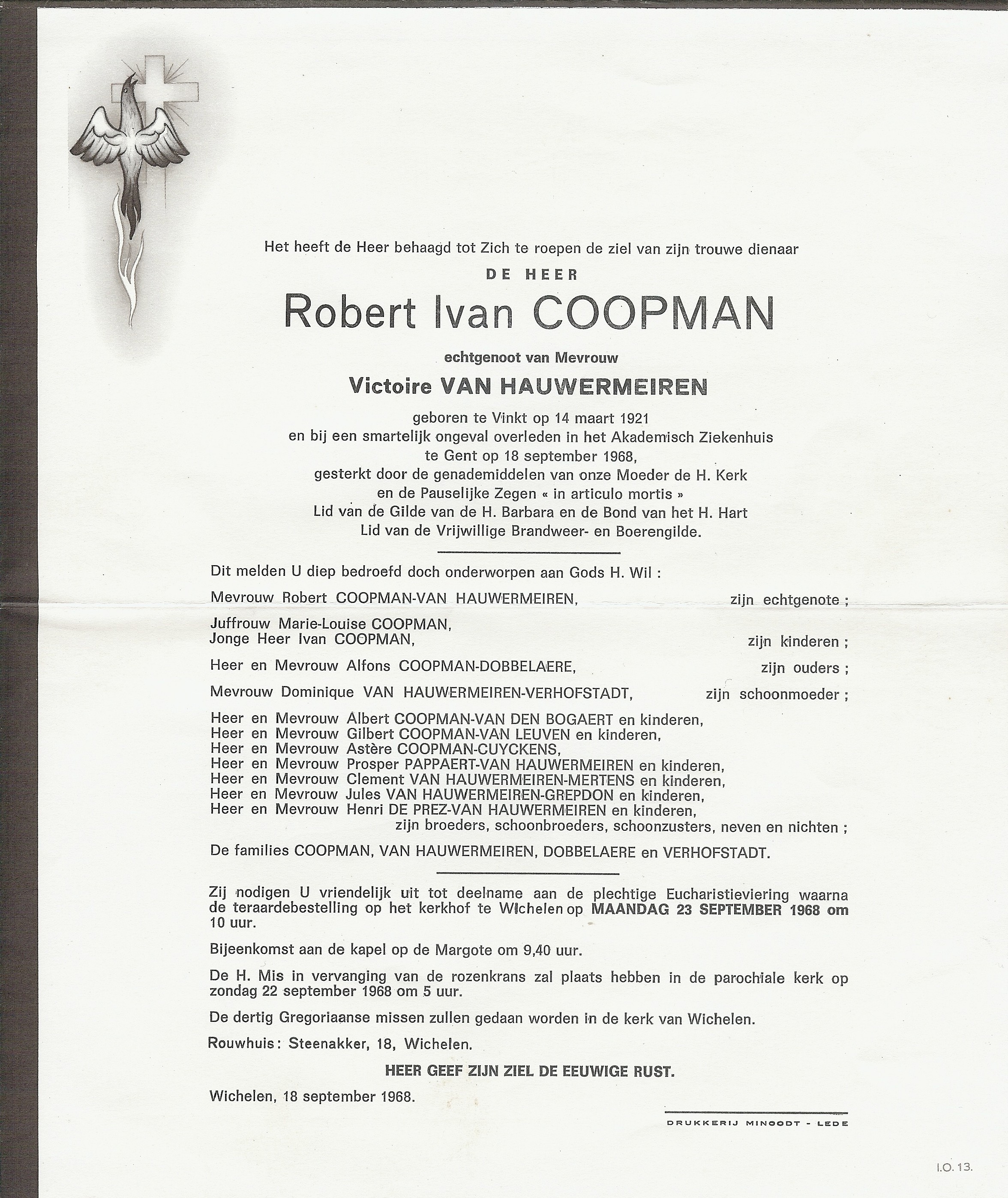 Robert Ivan Coopman Geboren: 14 maart 1921 — Vinkt Overleden: 18 september 1968 — Gent |