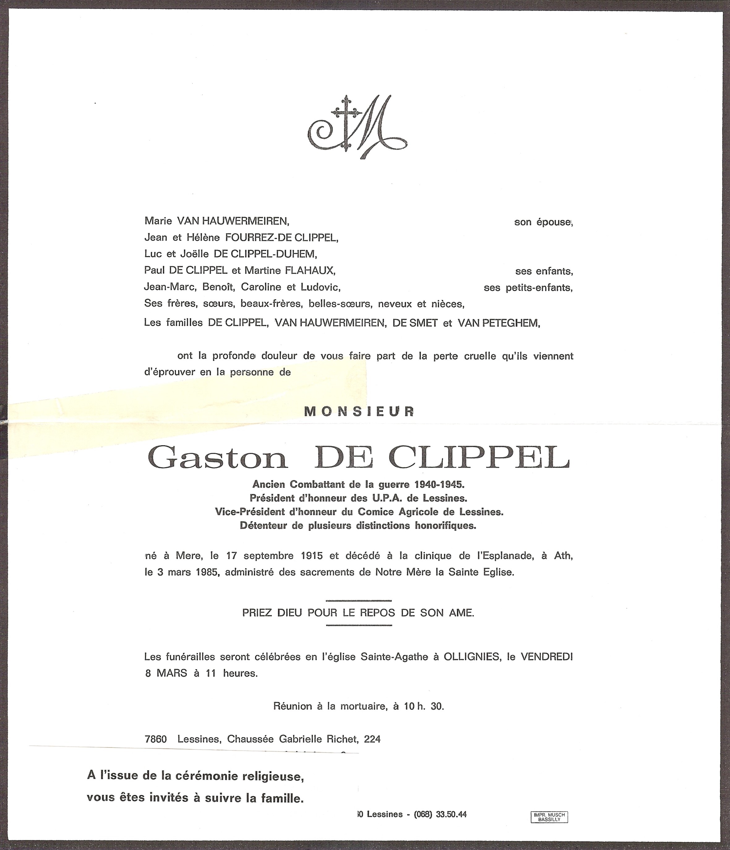 Gaston De Clippel Geboren: 17 september 1915 — Mere Overleden: 3 maart 1985 — Ath |