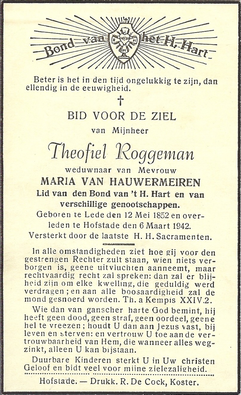 Remigus Theophilus Roggeman Geboren: 12 mei 1852 — Lede Overleden: 6 maart 1942 — Hofstade |