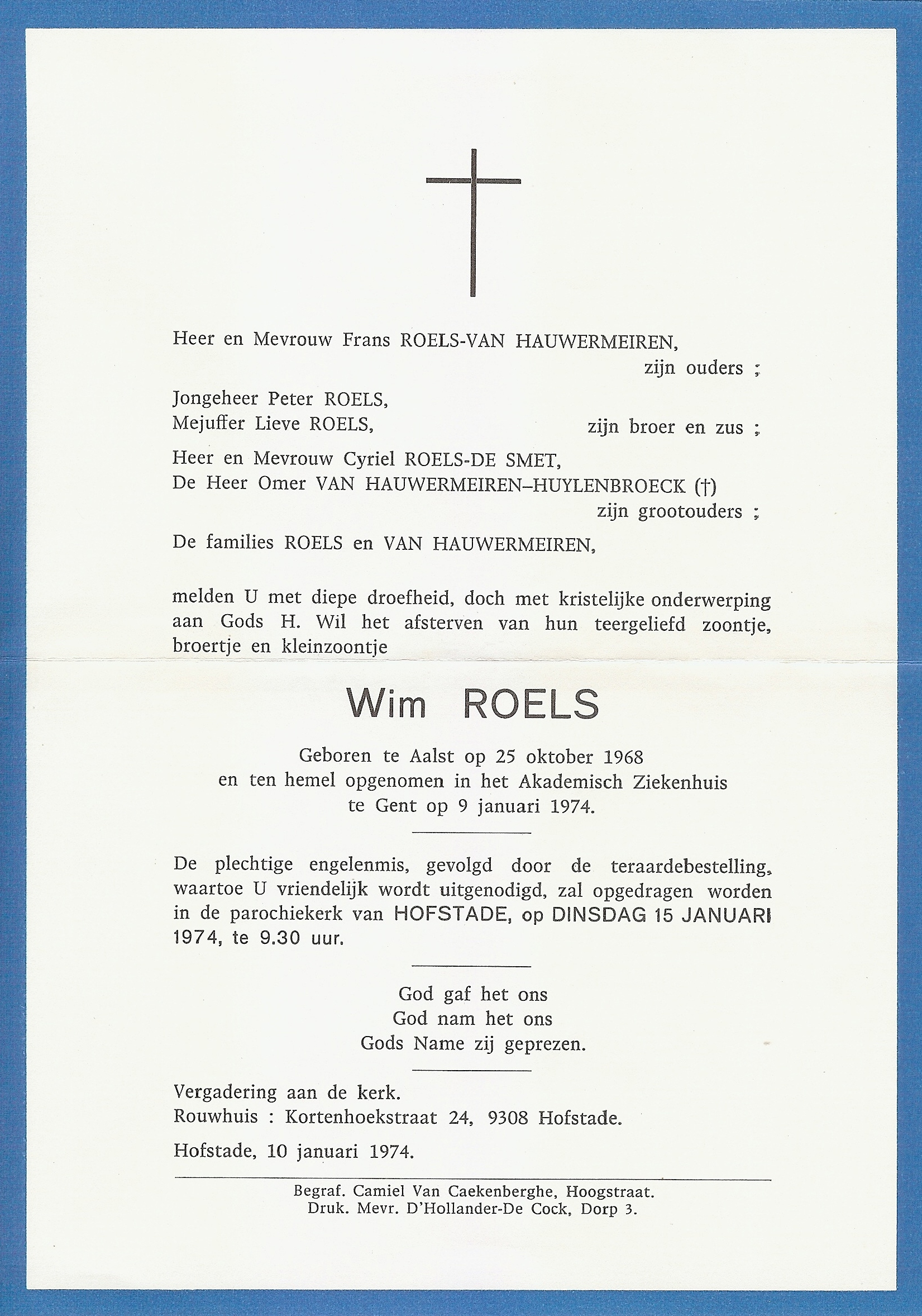 Begrafenis van een kleinzoon | Wim Roels 15 januari 1974 (Leeftijd 68 jaar) |