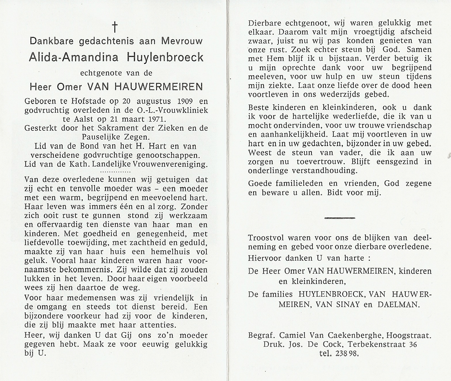 Alida-Amandina Huylenbroeck Geboren: 20 augustus 1909 — Hofstade Overleden: 21 maart 1971 — Aalst |
